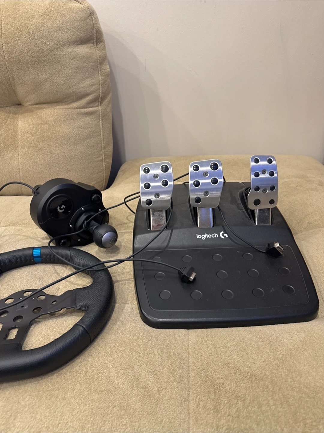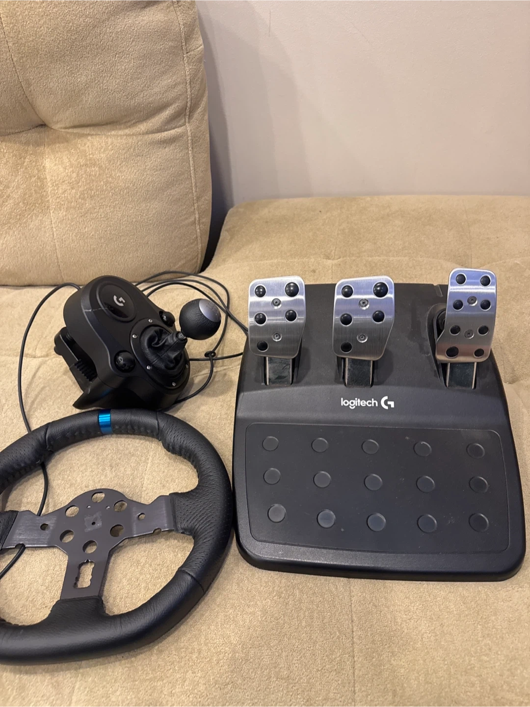 This is a Logitech G29 racing wheel setup with pedals and shifter. The wheel is made of leather and features a durable metal frame. The pedals are made of brushed metal for a premium feel. This set is ready for your next racing simulation! Wheel hub is broken but if you want you can take it with everything else