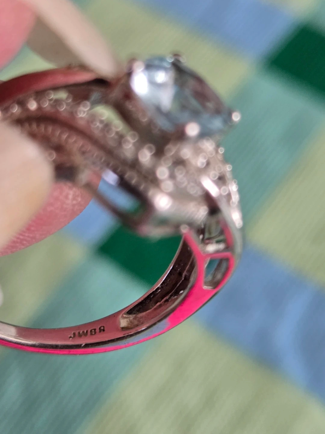 JWBR stamped on inside of ring which is the Jewelry Maker's Mark/Trademark for Renaissance Jewelry New York Inc. They often set diamonds in sterling silver but I cannot guarantee they are diamonds.