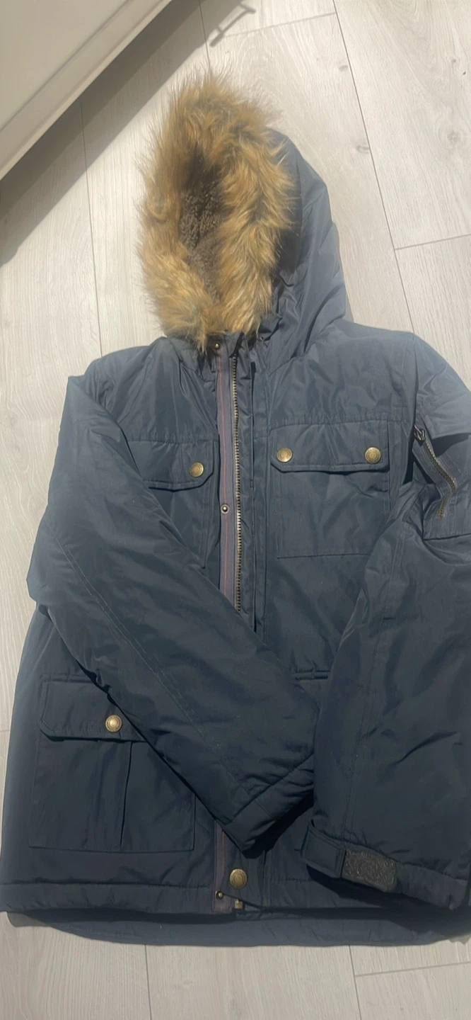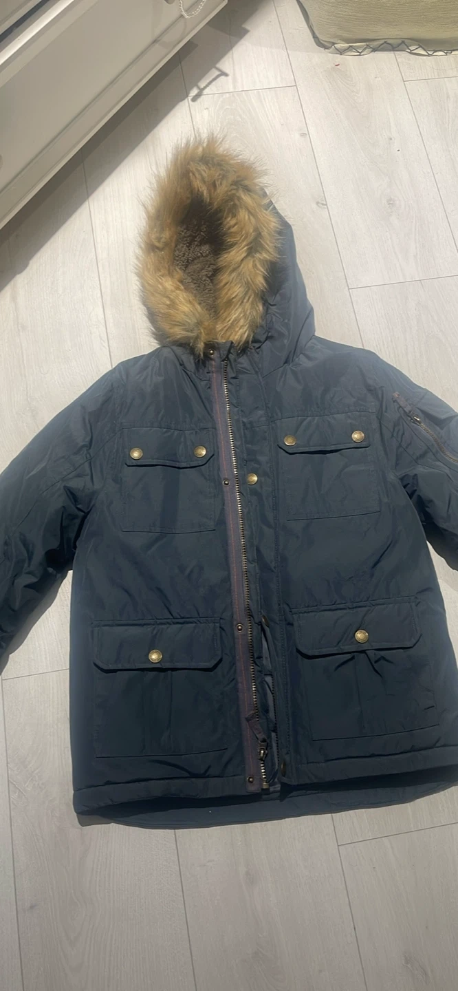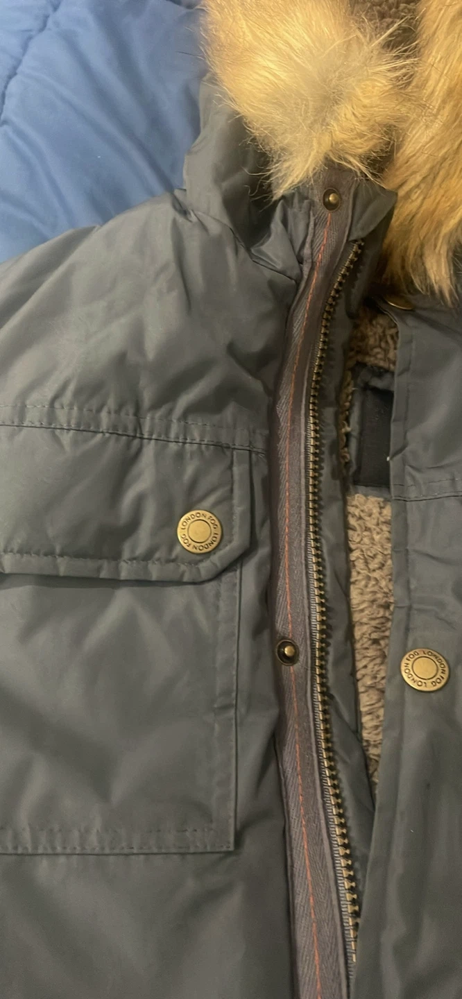 This F.O.G. by London Fog boys' winter jacket is size 14. It's made with a polyester lining and padding, and features a faux fur trim. This coat offers great warmth for colder weather!