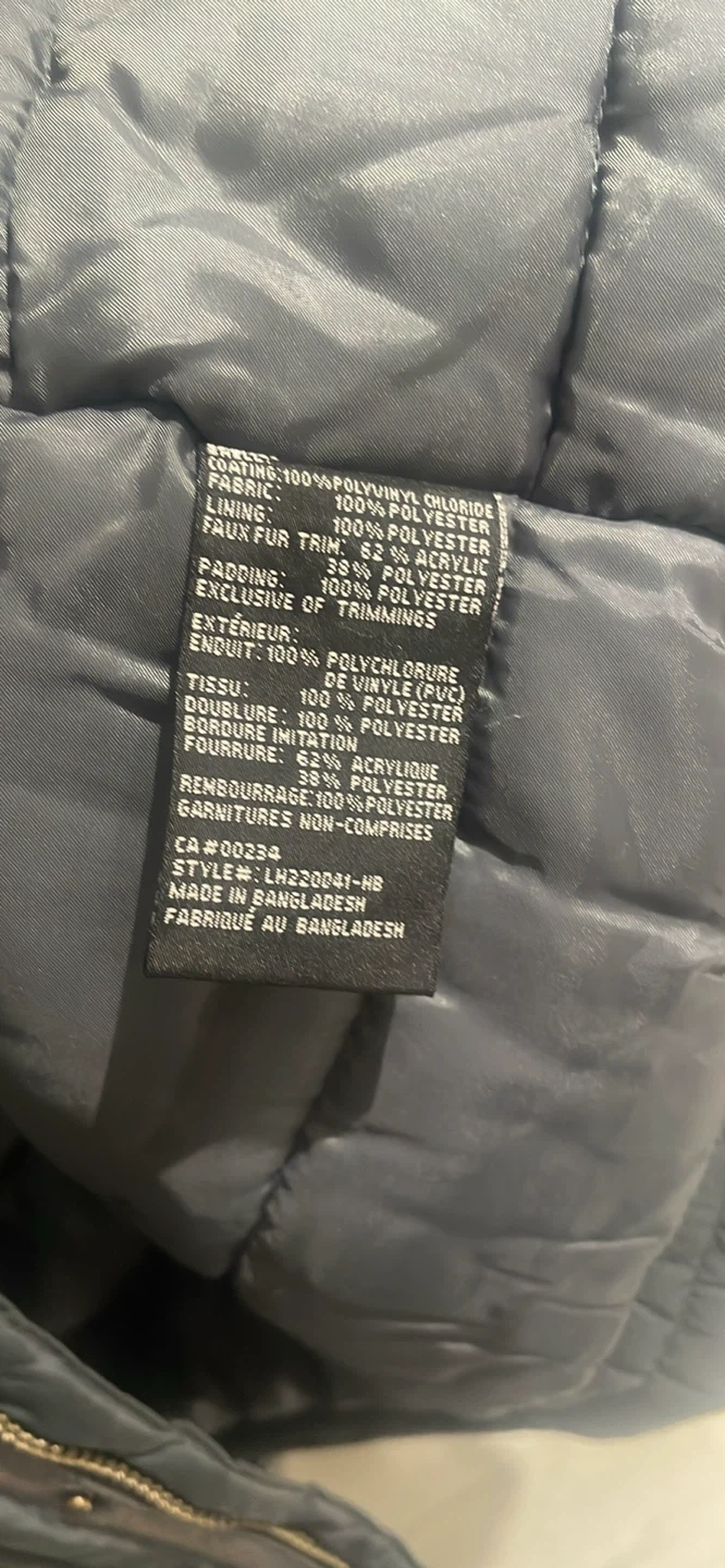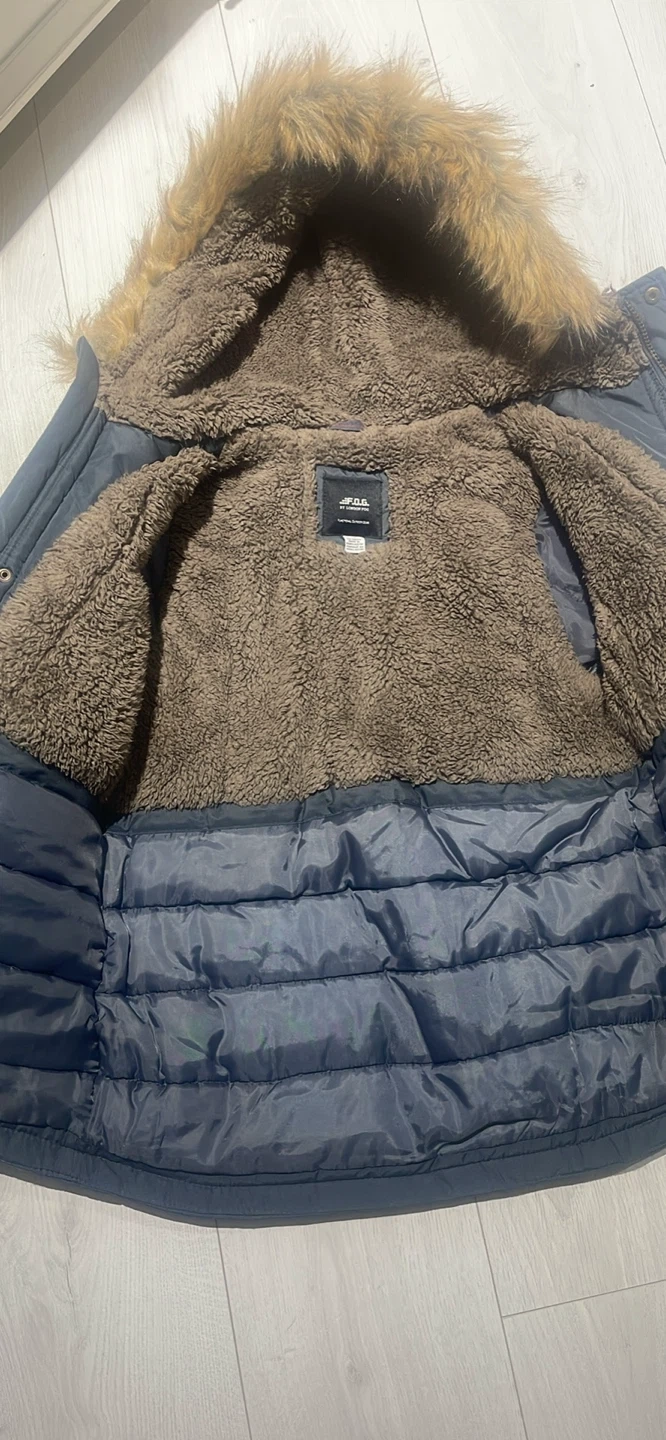 This F.O.G. by London Fog boys' winter jacket is size 14. It's made with a polyester lining and padding, and features a faux fur trim. This coat offers great warmth for colder weather!
