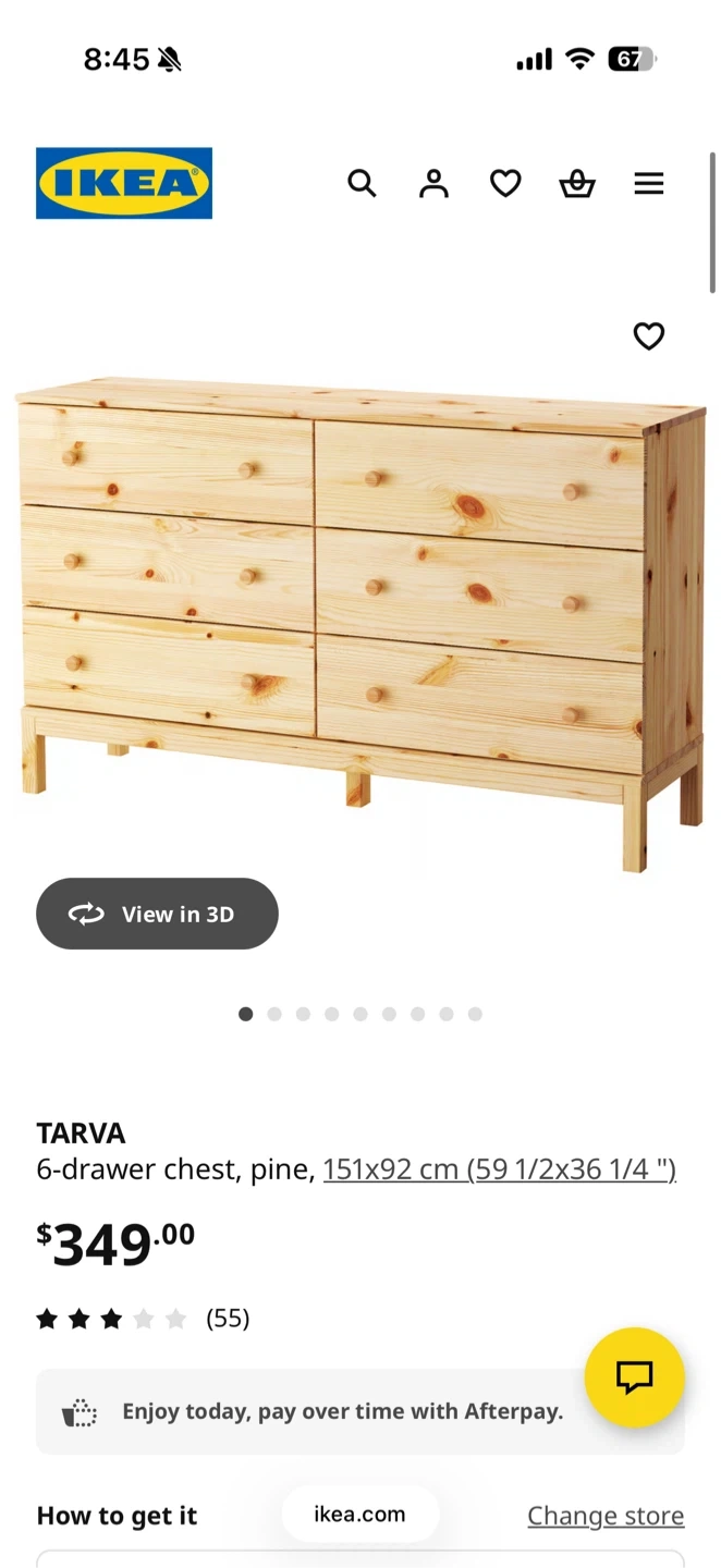 This IKEA TARVA chest features 6 drawers and is made of pine. It measures 151x92 cm (59 1/2x36 1/4 "). This dresser is great for storing clothes and linens in a bedroom.
