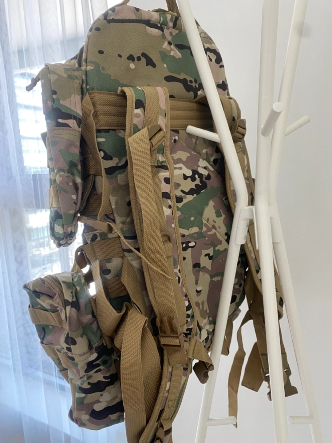 Large tactical backpack. Multiple pockets and compartments. Adjustable straps. Camo print. Great for hiking or outdoor activities.