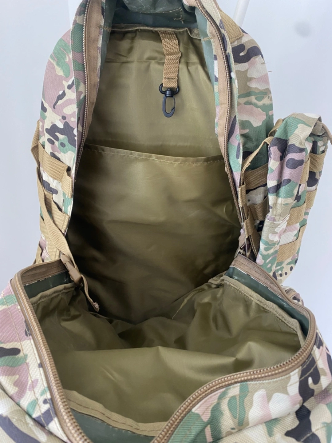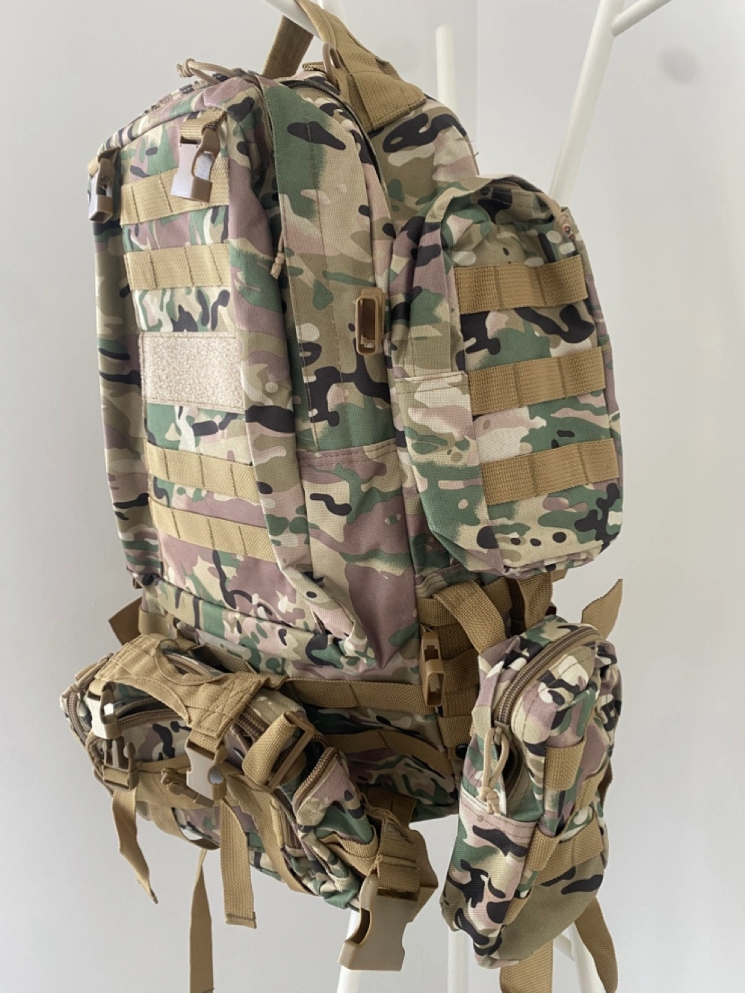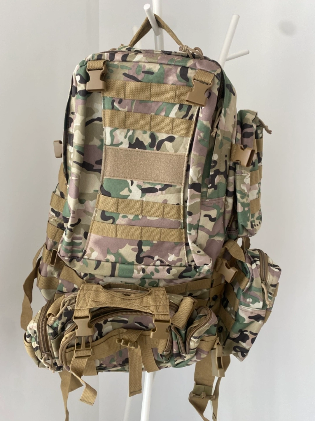 Large tactical backpack. Multiple pockets and compartments. Adjustable straps. Camo print. Great for hiking or outdoor activities.