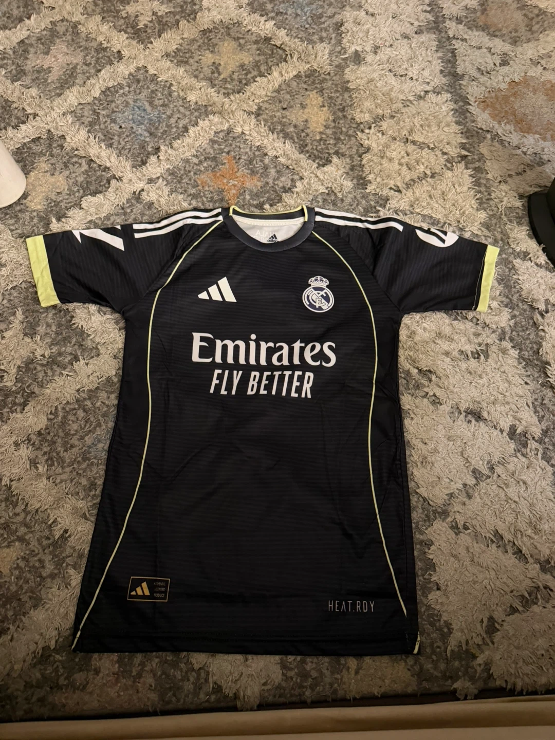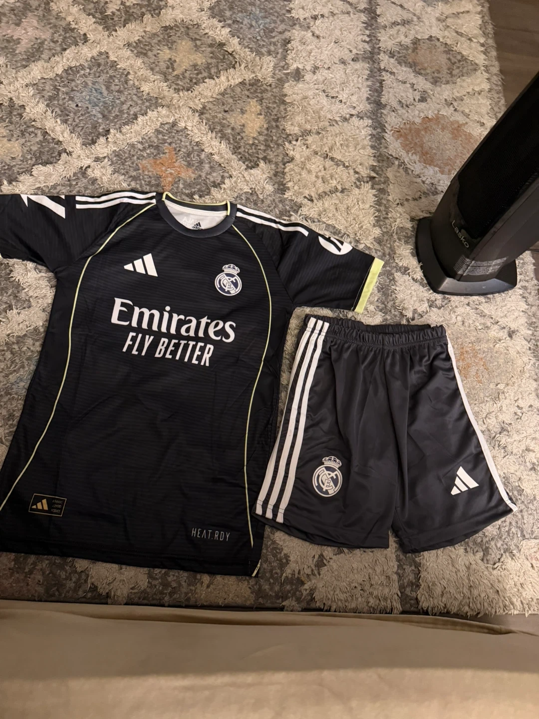 This is a Real Madrid soccer jersey and shorts set. The jersey features 'Emirates Fly Better' and 'Mbappé 10' on the back. It's made with Heat.Rdy technology. A great set for any soccer fan!