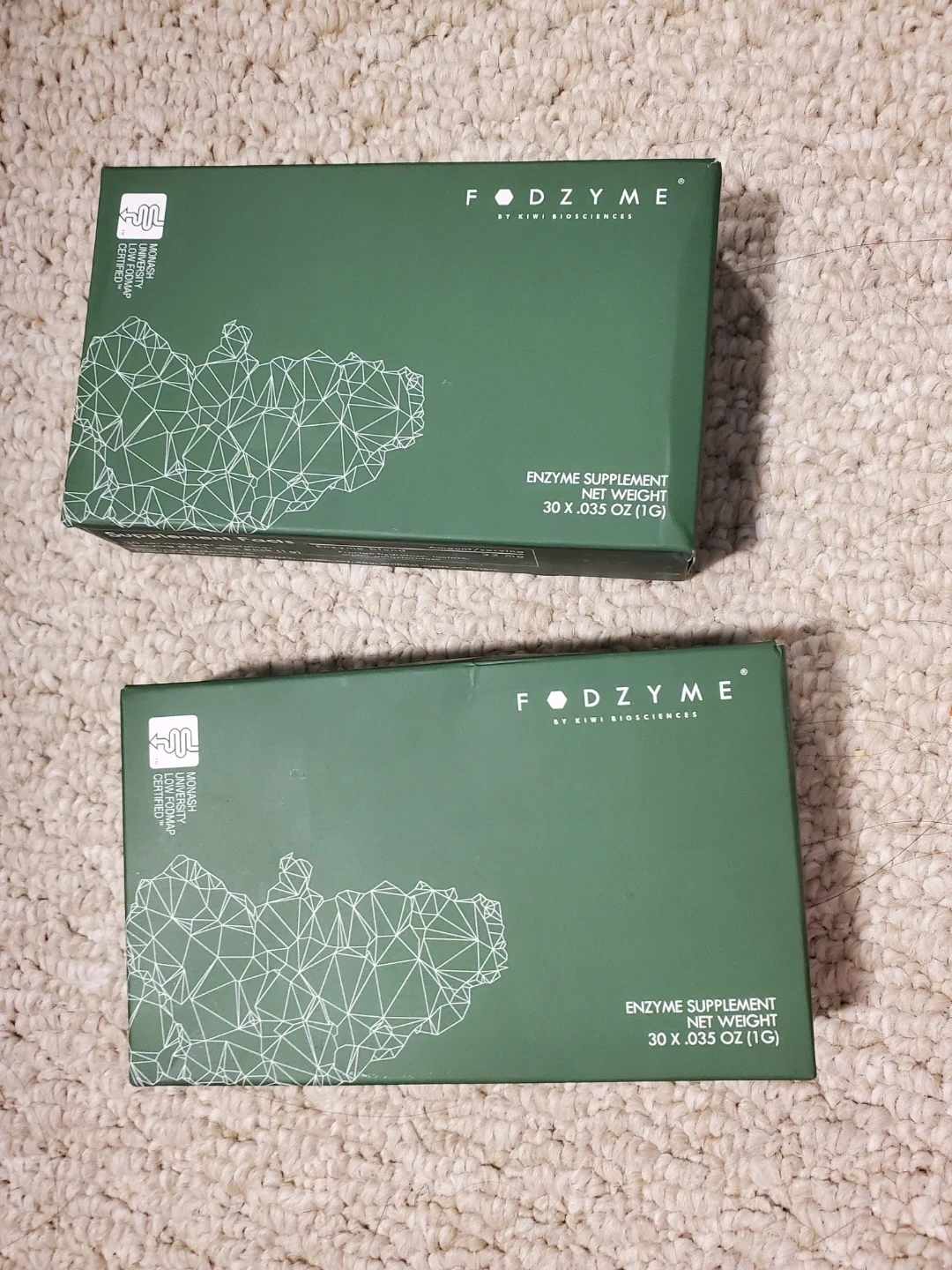 Two boxes of FODZYME enzyme supplement. Partially used, 40 packets remain. This enzyme blend includes Fructan hydrolase, lactase, and alpha-galactosidase. Works for lactose intolerance, galactooligosaccharide intolerance, and fructan intolerance.