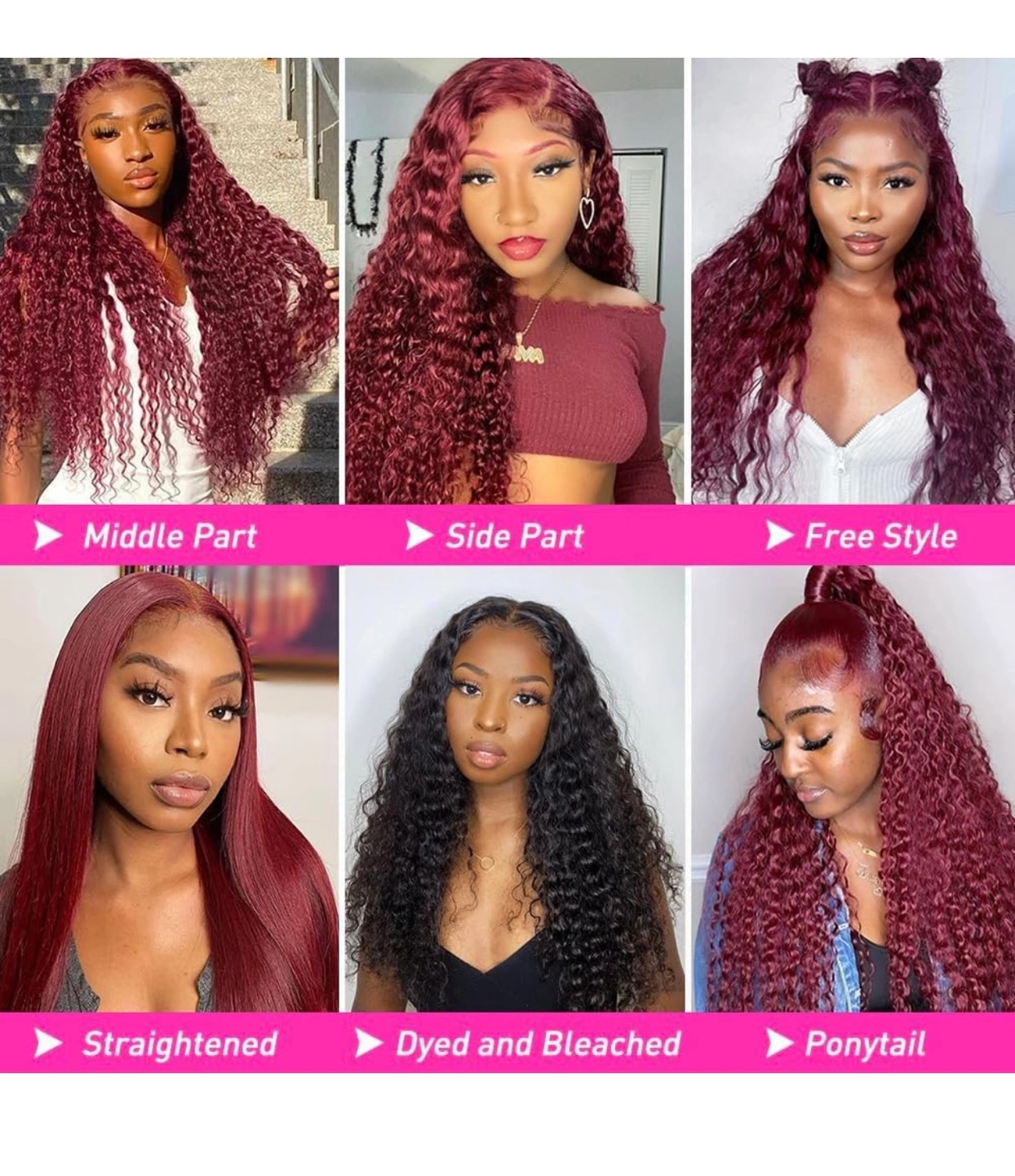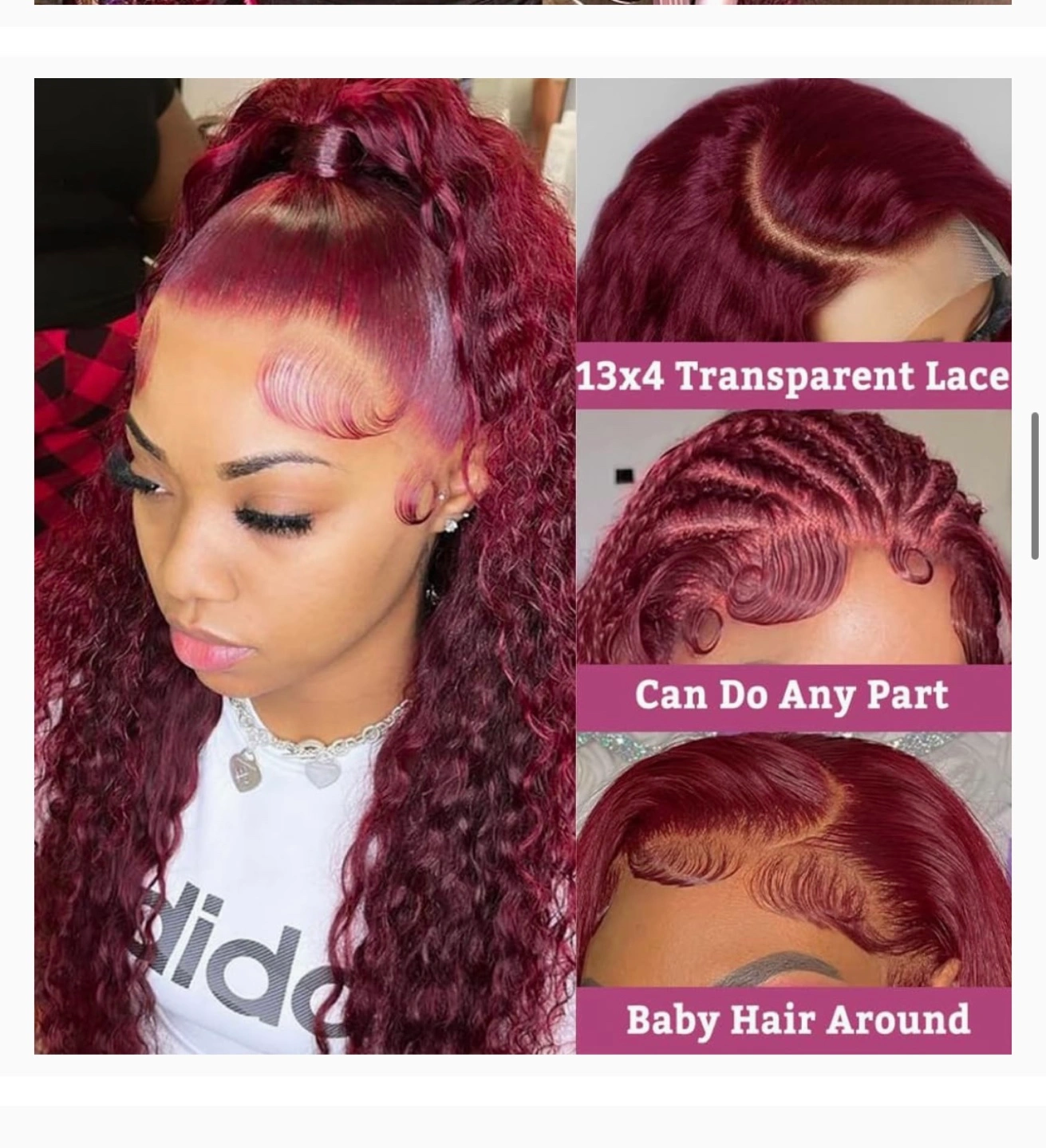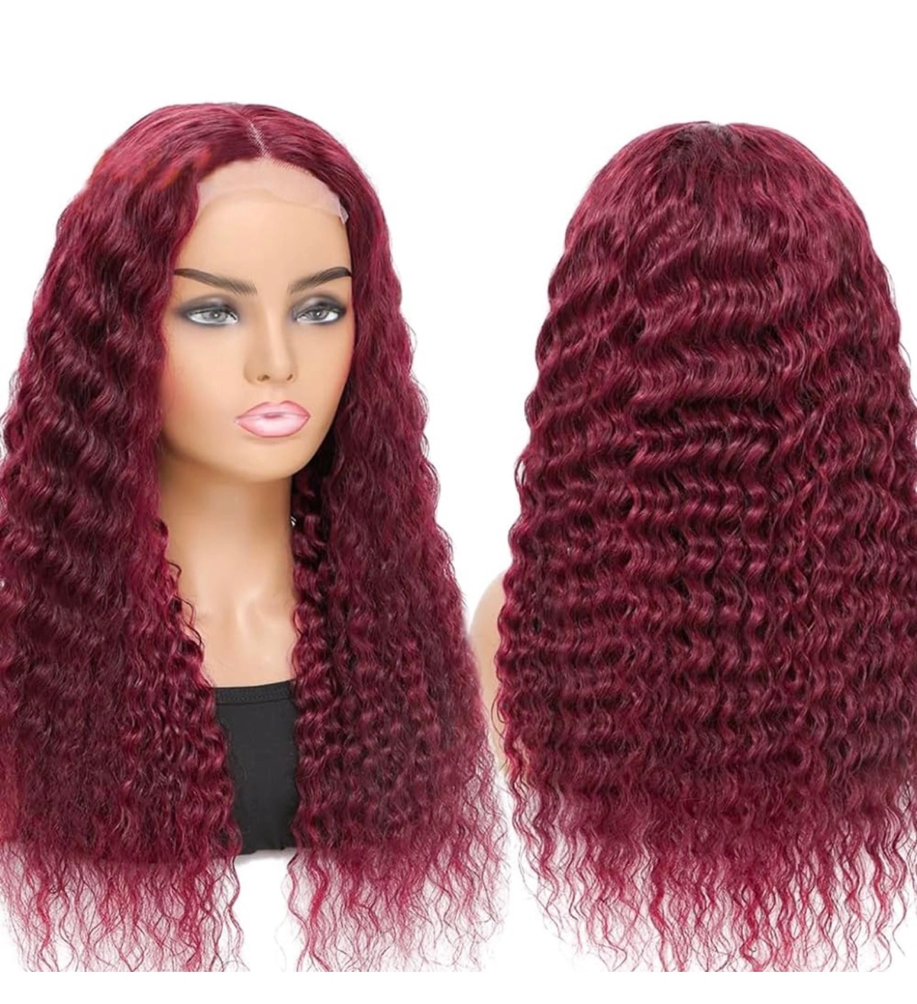 13x4 transparent lace wig. Burgundy red colour. Deep wave texture. Baby hair around. Can be styled in many ways. Multiple lengths available.