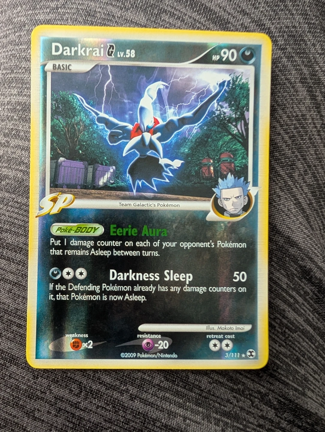 This is a Darkrai basic Pokemon card. It has 90 HP and its "Eerie Aura" Poké-Body ability puts each opponent's Pokémon to sleep. Darkness Sleep attack deals 50 damage. Published in 2009.