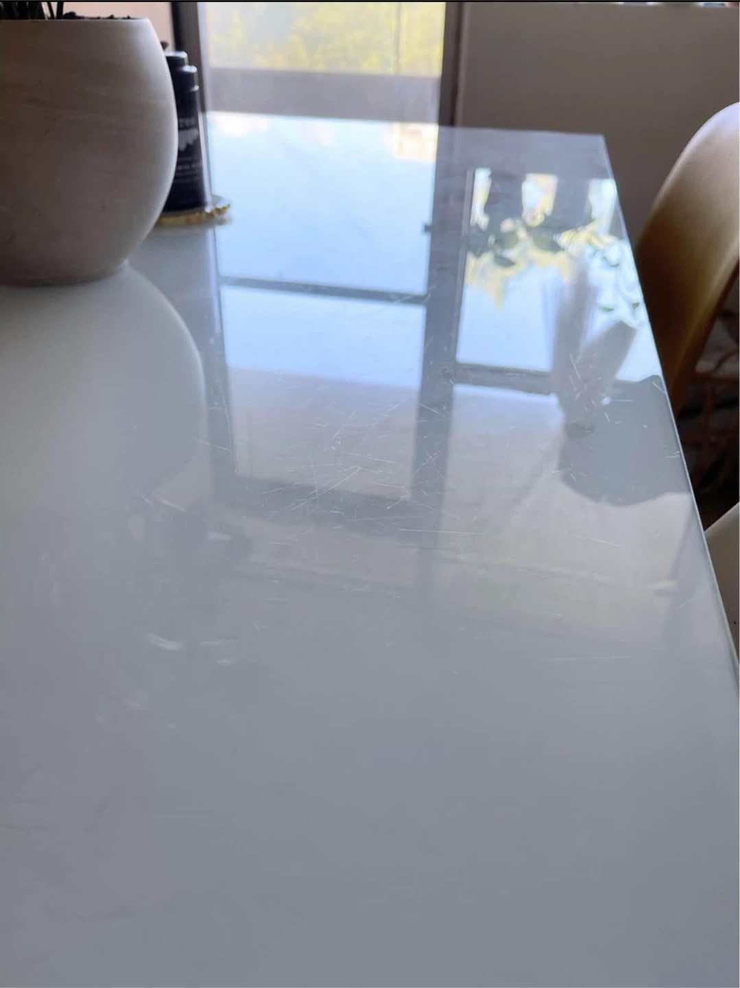 Glass top dining table with chrome legs. Some minor surface scratches on the tabletop.