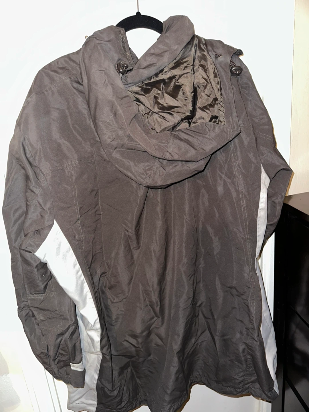 Light weight but warm (fleece interior) brown and grey woman’s jacket. This jacket would be great for travel, hiking, or camping. It’s not for winter weather unless you have layers underneath.