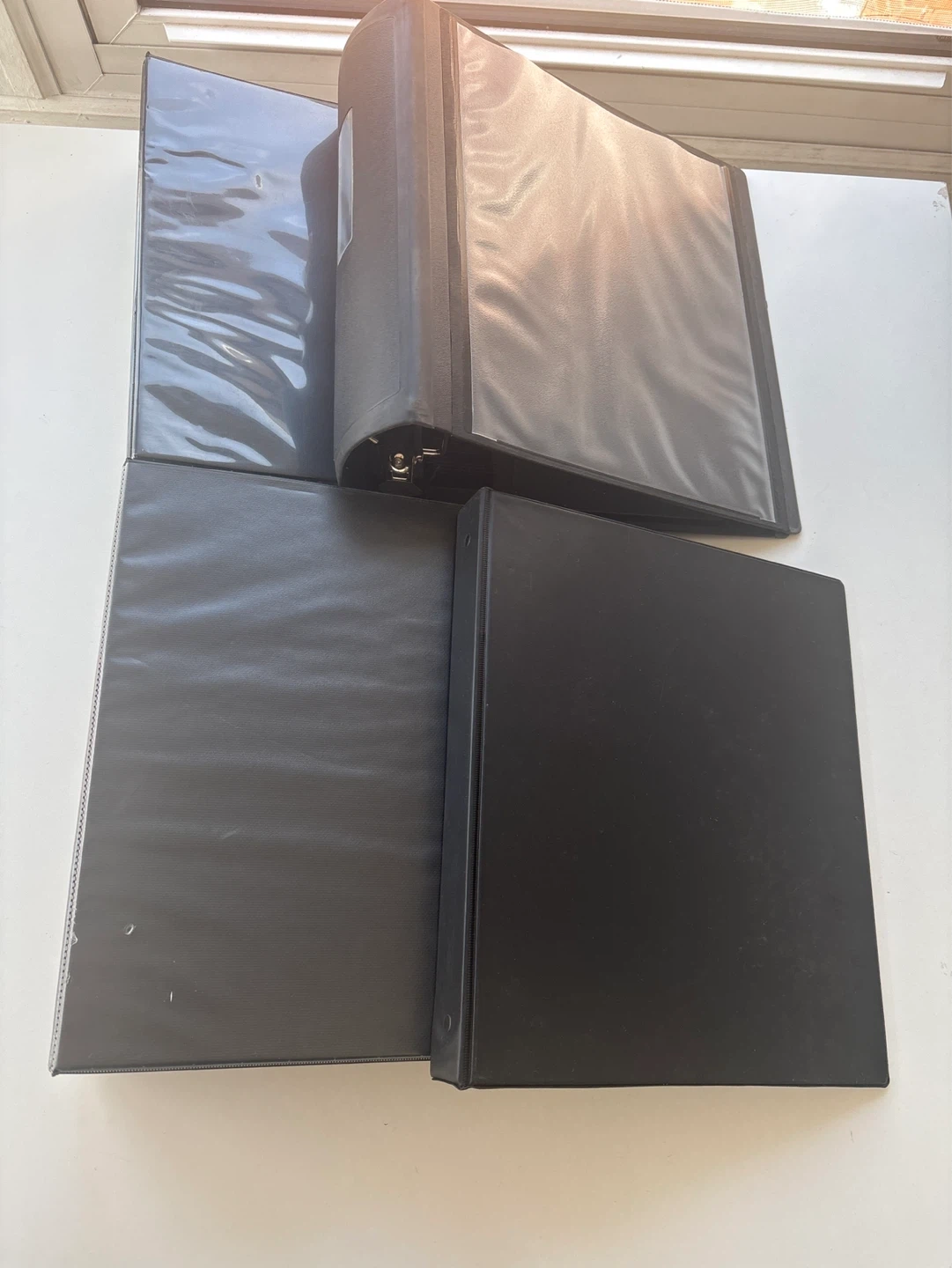 Four black binders are included. Two are 3-ring binders with 1.5-inch capacity rings. Two others are also 3-ring binders, one with clear pocket sleeves and another with a built-in label holder. They're perfect for organizing documents or photos!