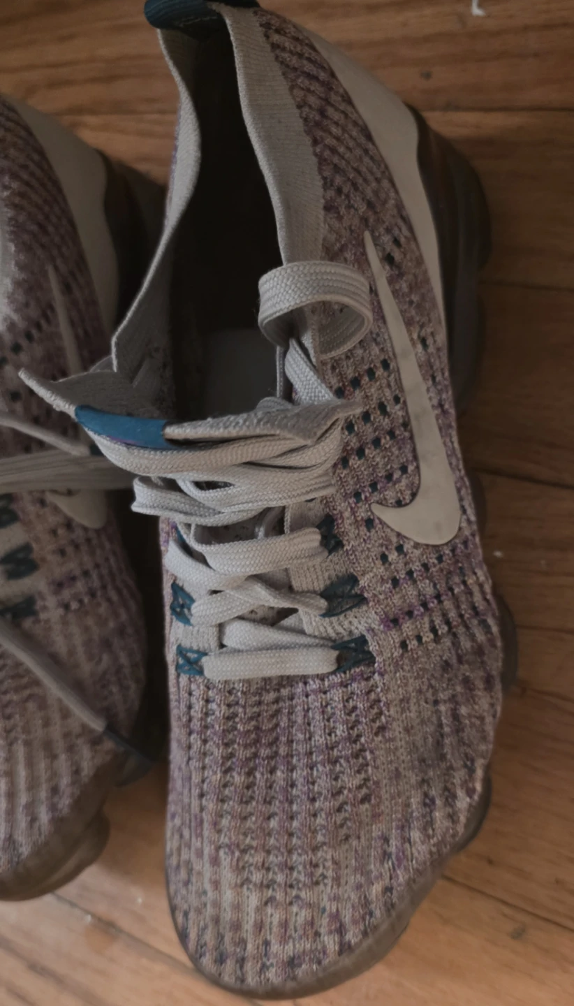 PREOWNED These Nike Vapormax Flyknit 3 shoes feature a breathable knit upper with a multicolor design. They have a comfortable lace-up closure and a cushioned sole. US Women's size 7.5.