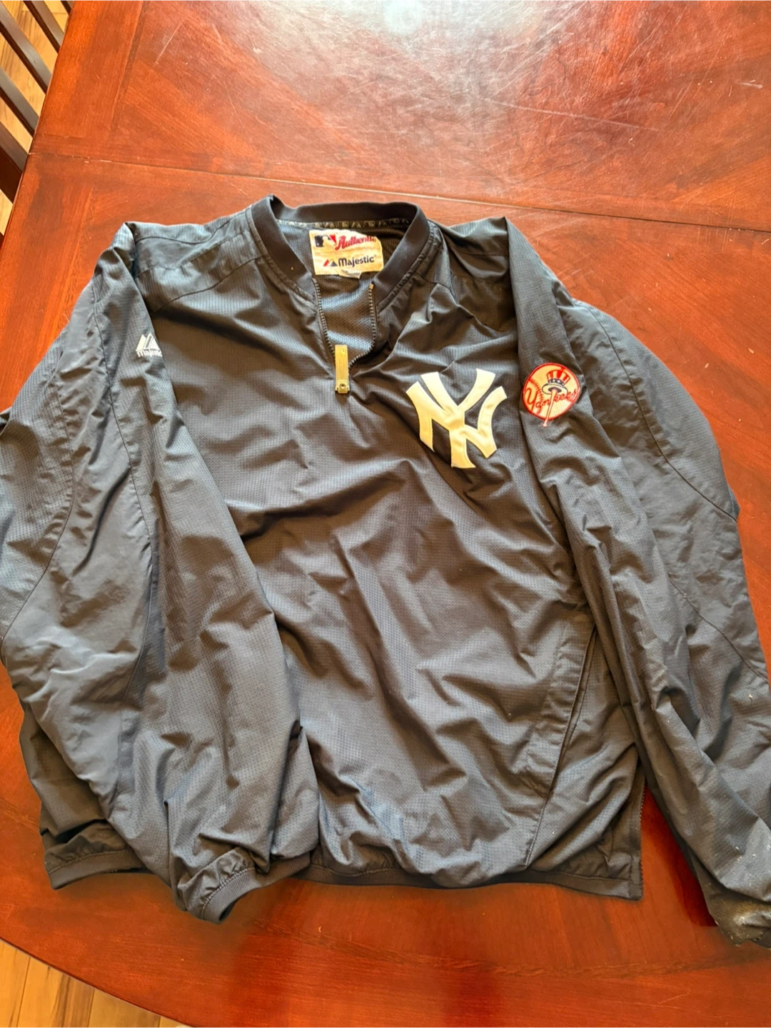 This Majestic pullover jacket features the New York Yankees logo. It's a dark navy colour with a half-zip closure. A great piece for any baseball fan!
