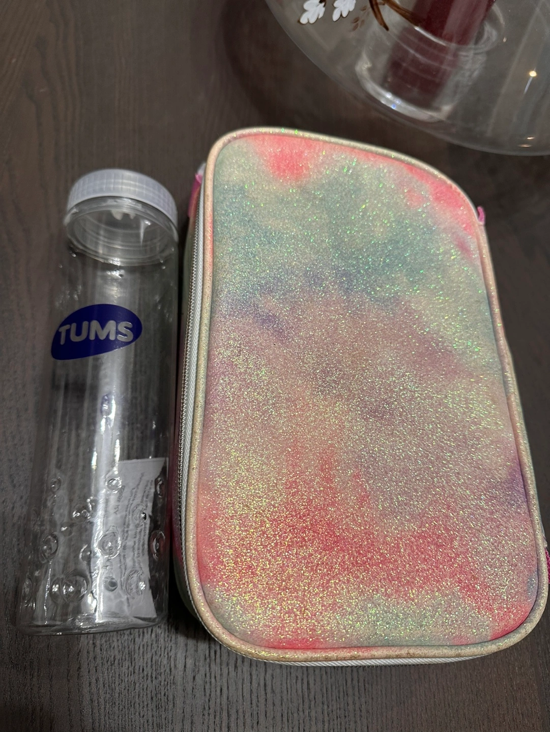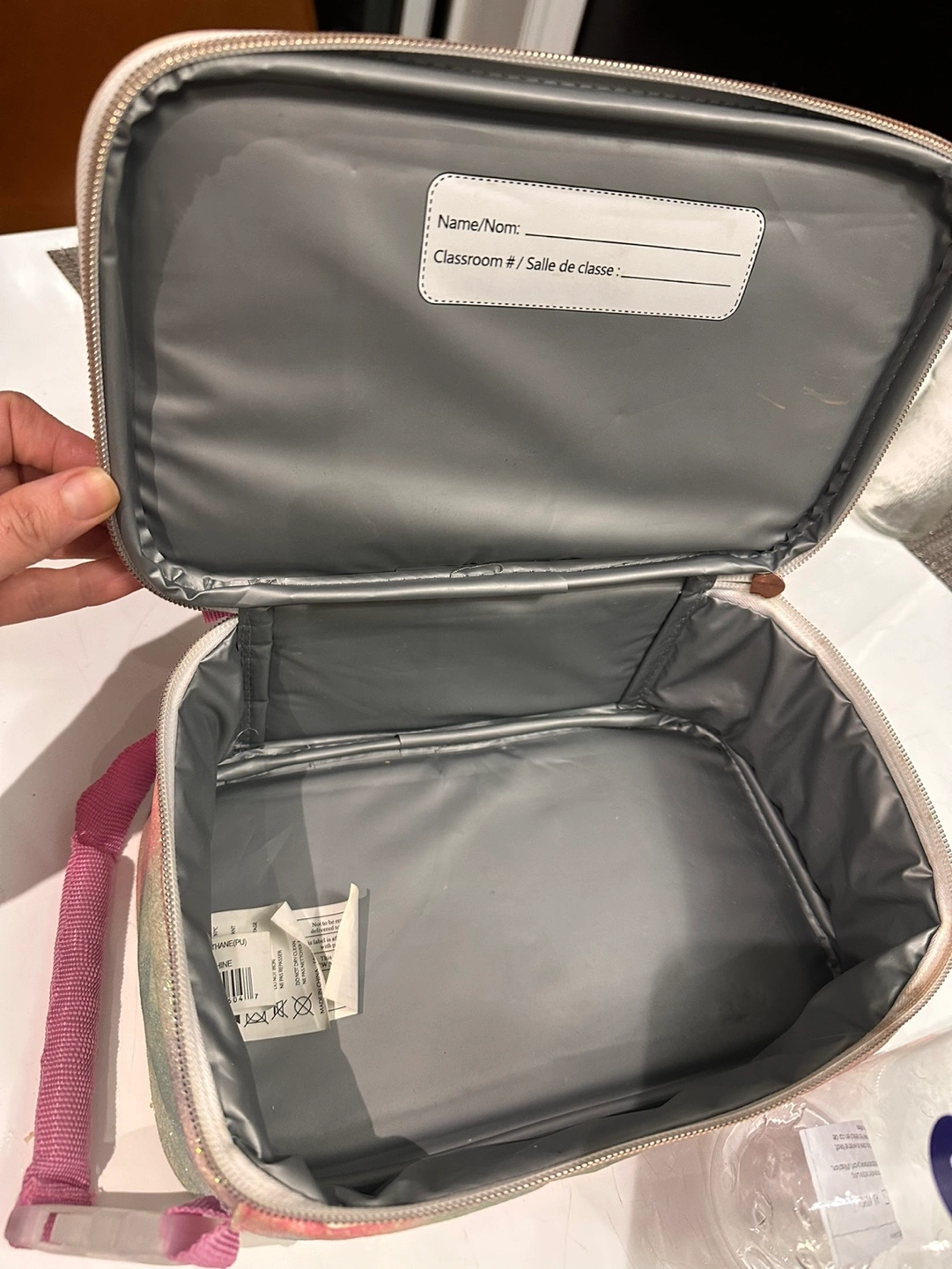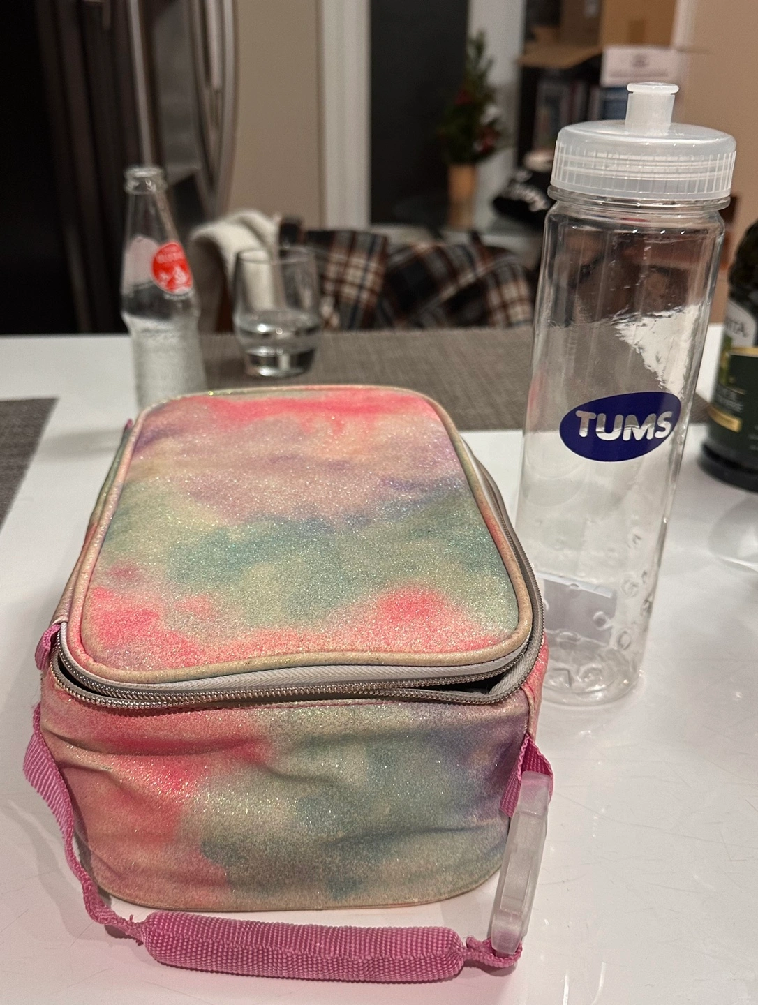 Lunch bag with a pink glitter design. Includes a new plastic water bottle. This lunch bag looks worn and old on the outside, but the inside is still in very good shape.