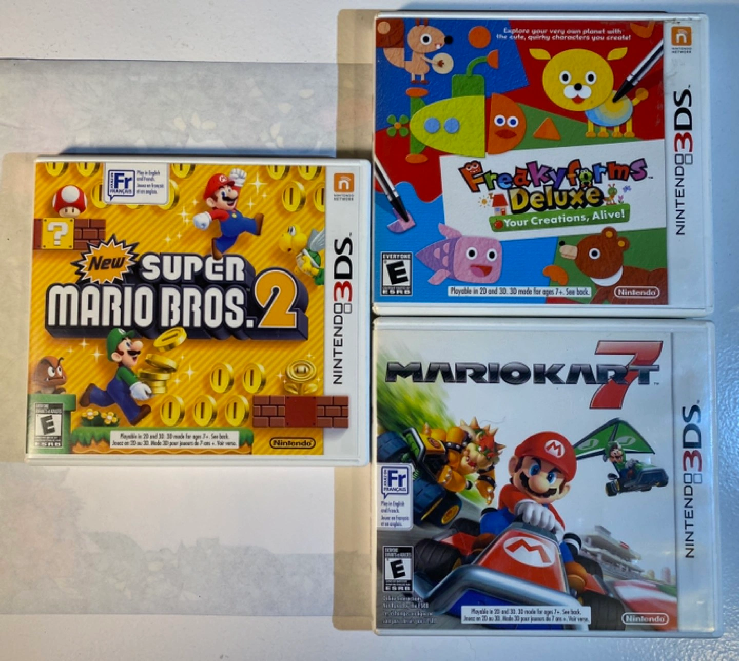 3 Games included: Mario Kart 7, Super Mario Bros 2, and Freaky Forms Deluxe