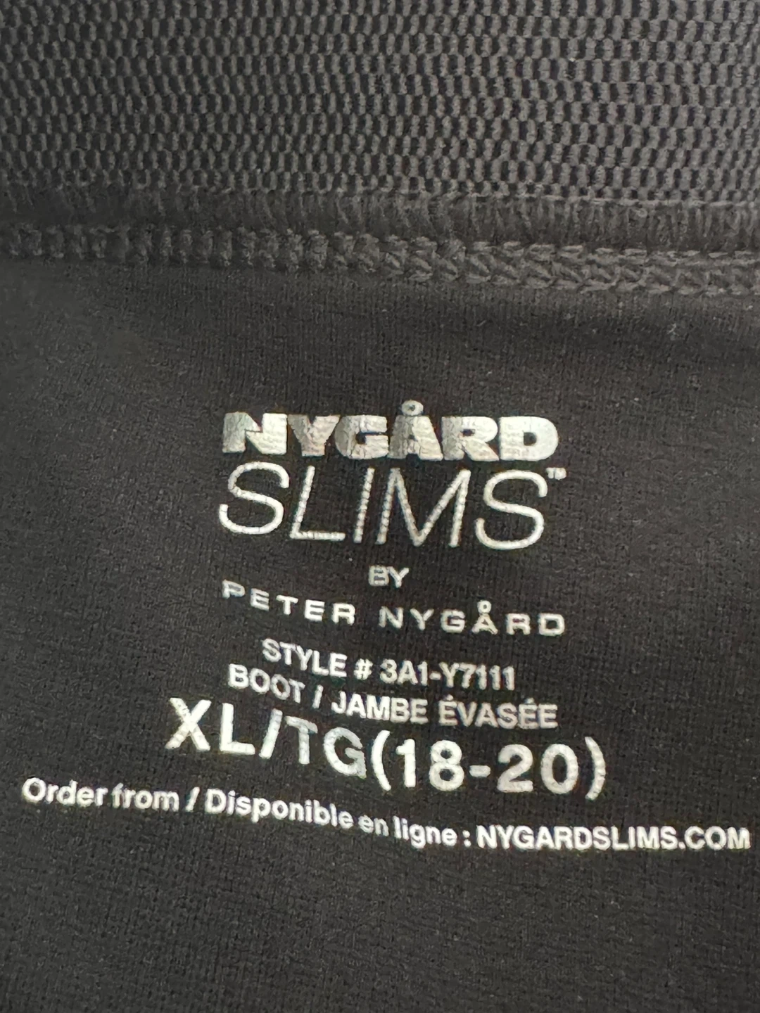 Selling a pair of Nygard Slims black bootcut pants in size XL (18-20). They're made of 70% rayon, 27% nylon, and 3% spandex, so they're super comfy! Machine wash cold and hang to dry for easy care