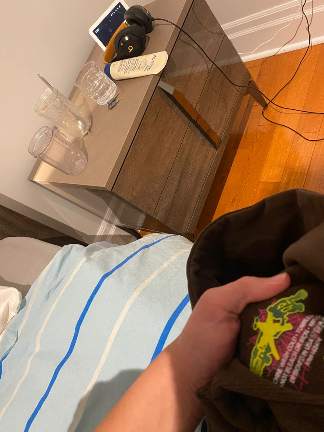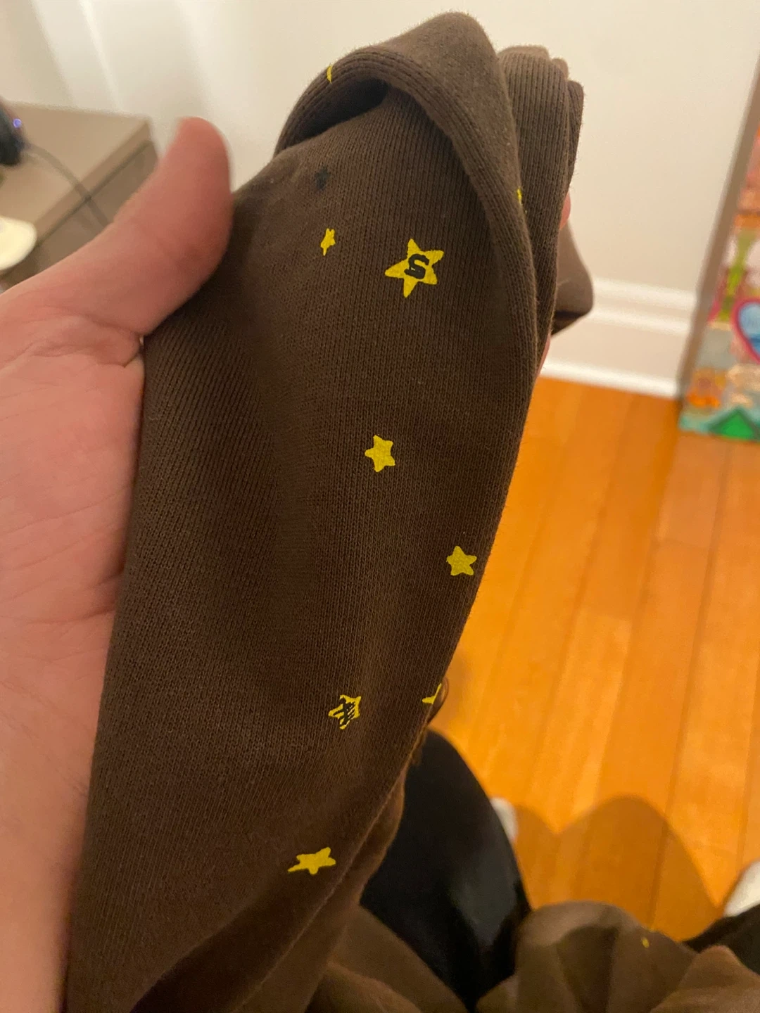 Brown hoodie with a pink spider web graphic and "sp5der" text on the front. Features yellow stars on the sleeves. Cotton material.