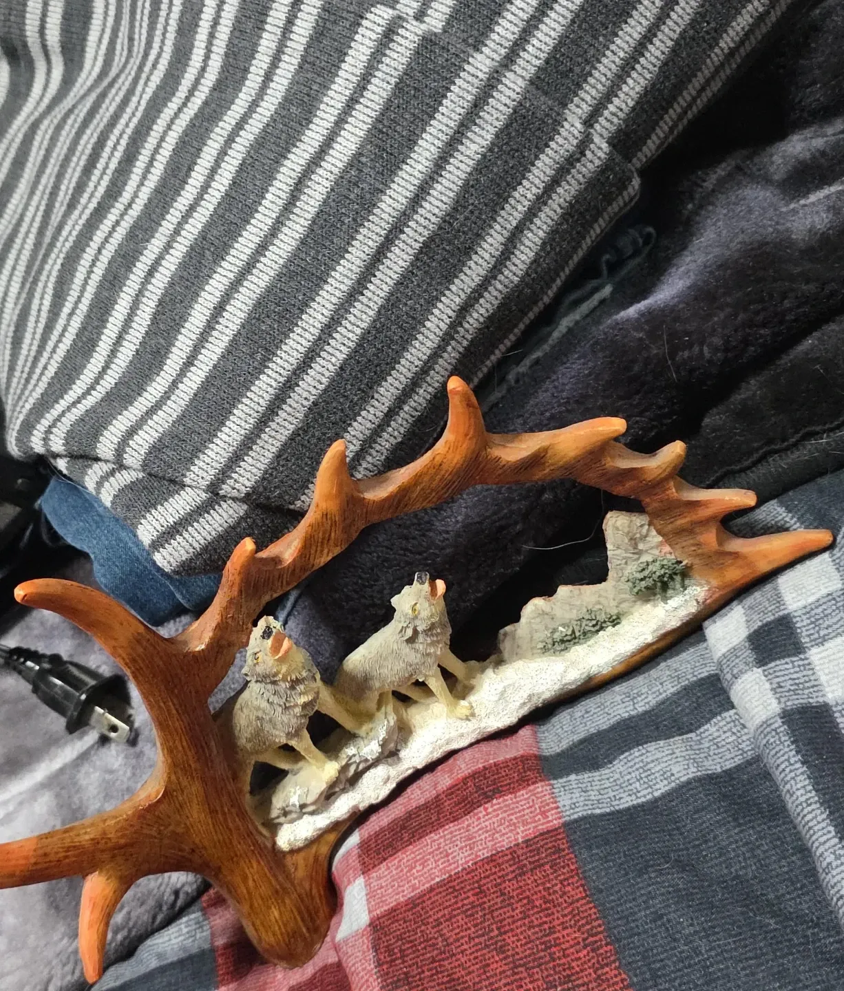 A unique wolf figurine mounted on a faux antler. It's a cute piece for any nature lover or collector! It features two wolves howling in a snowy scene, all nestled within the antler frame