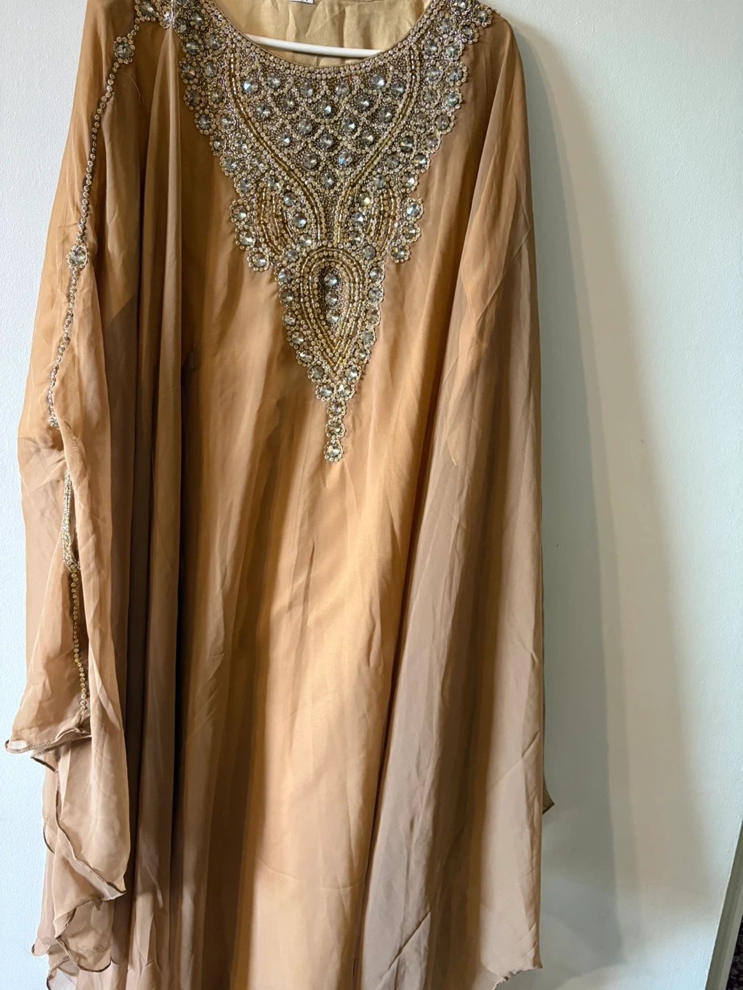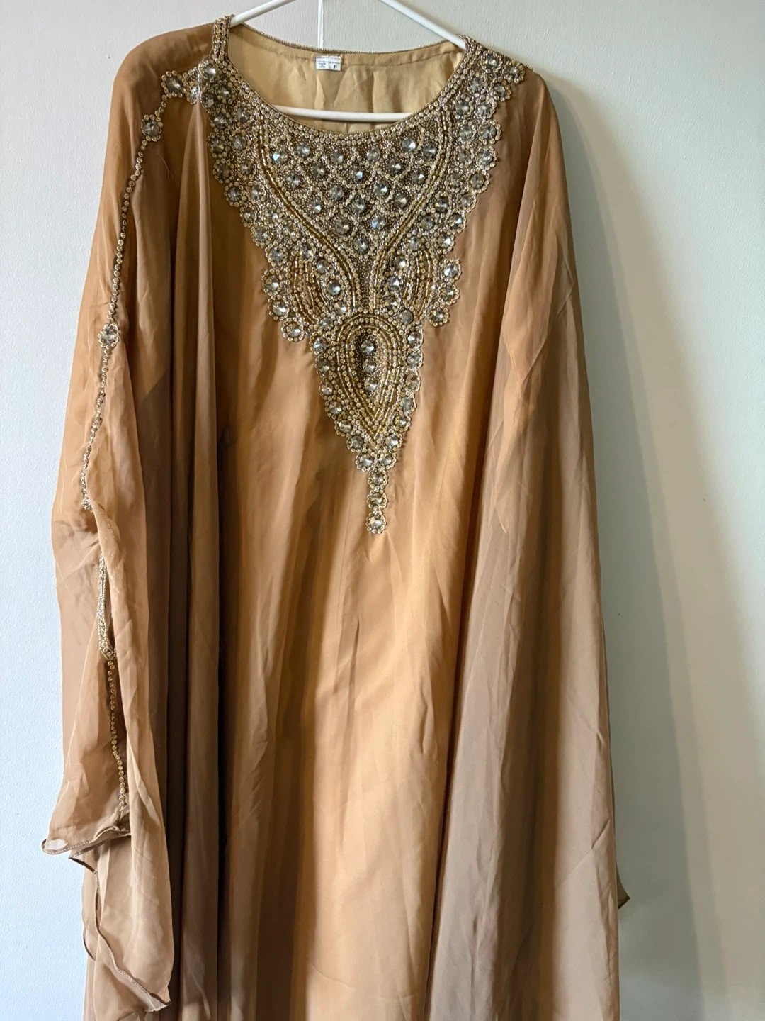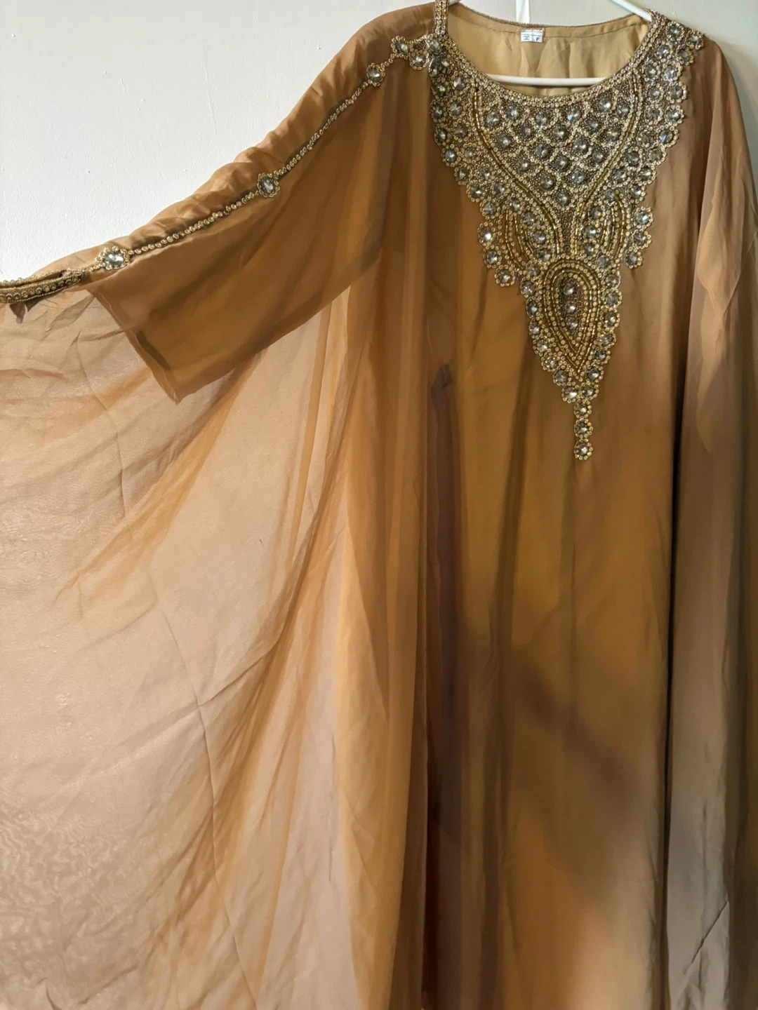 A beautiful beige kaftan with intricate gold and crystal embellishments on the neckline. Made in India. Sheer fabric with a silk lining. Perfect for special occasions!
