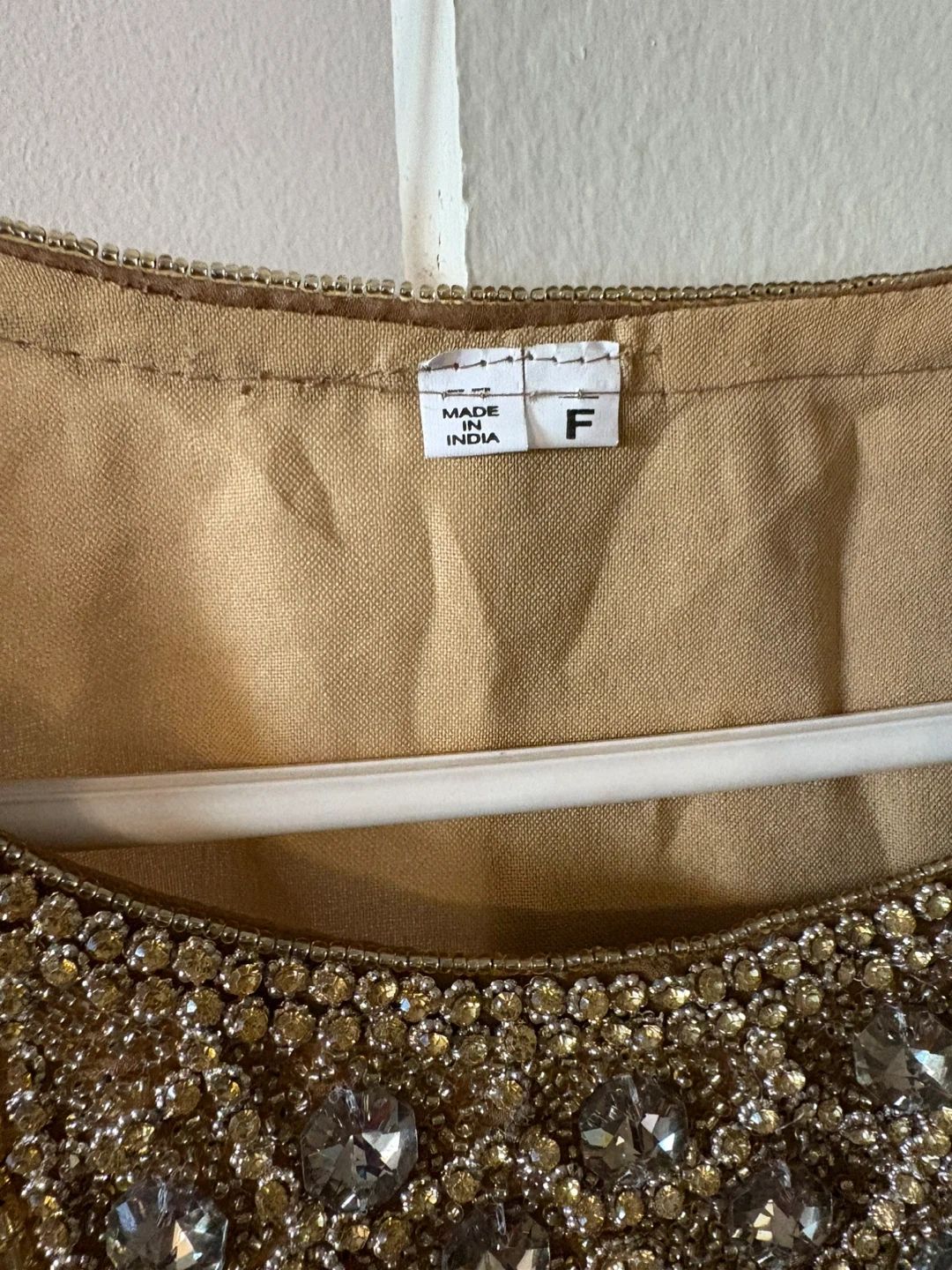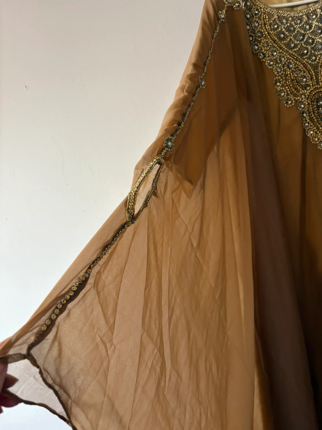 A beautiful beige kaftan with intricate gold and crystal embellishments on the neckline. Made in India. Sheer fabric with a silk lining. Perfect for special occasions!