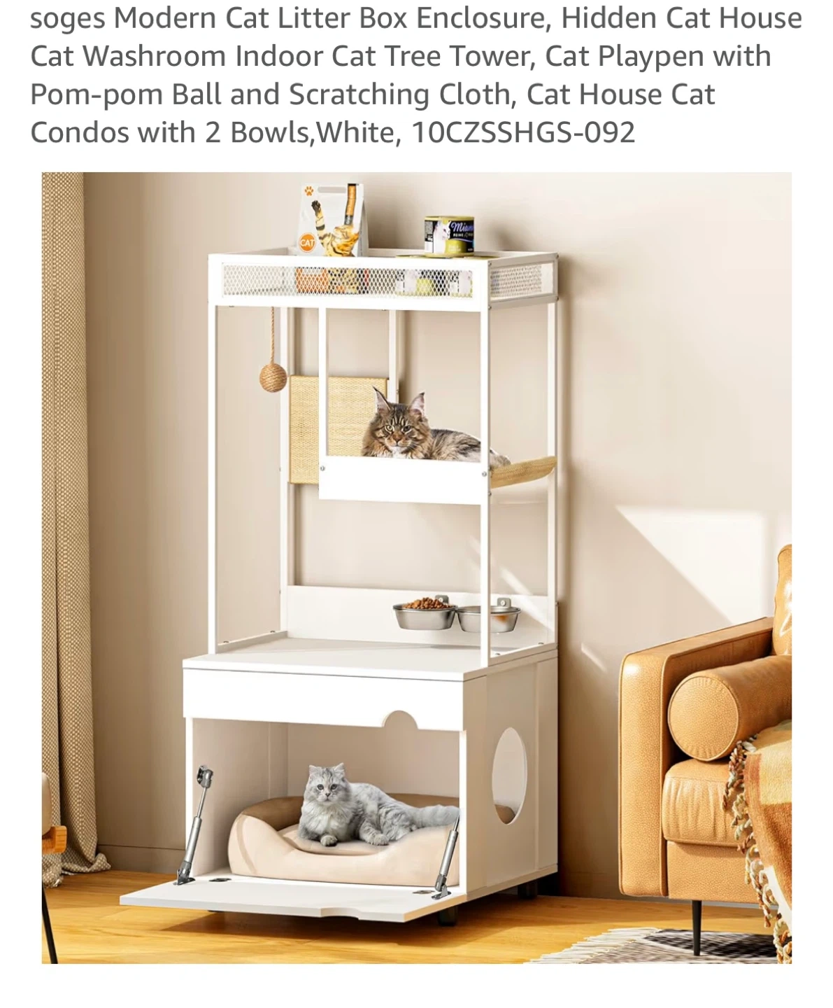 Soges Modern White Cat Litter Box Enclosure & Tree Tower
