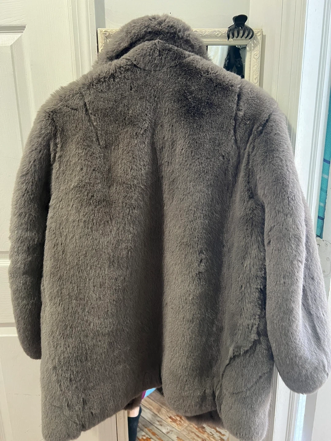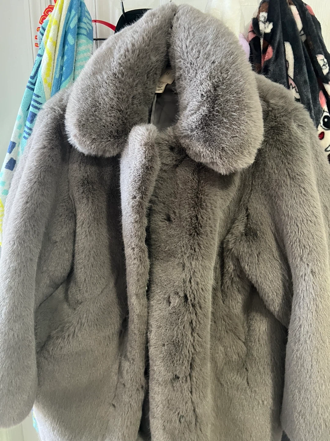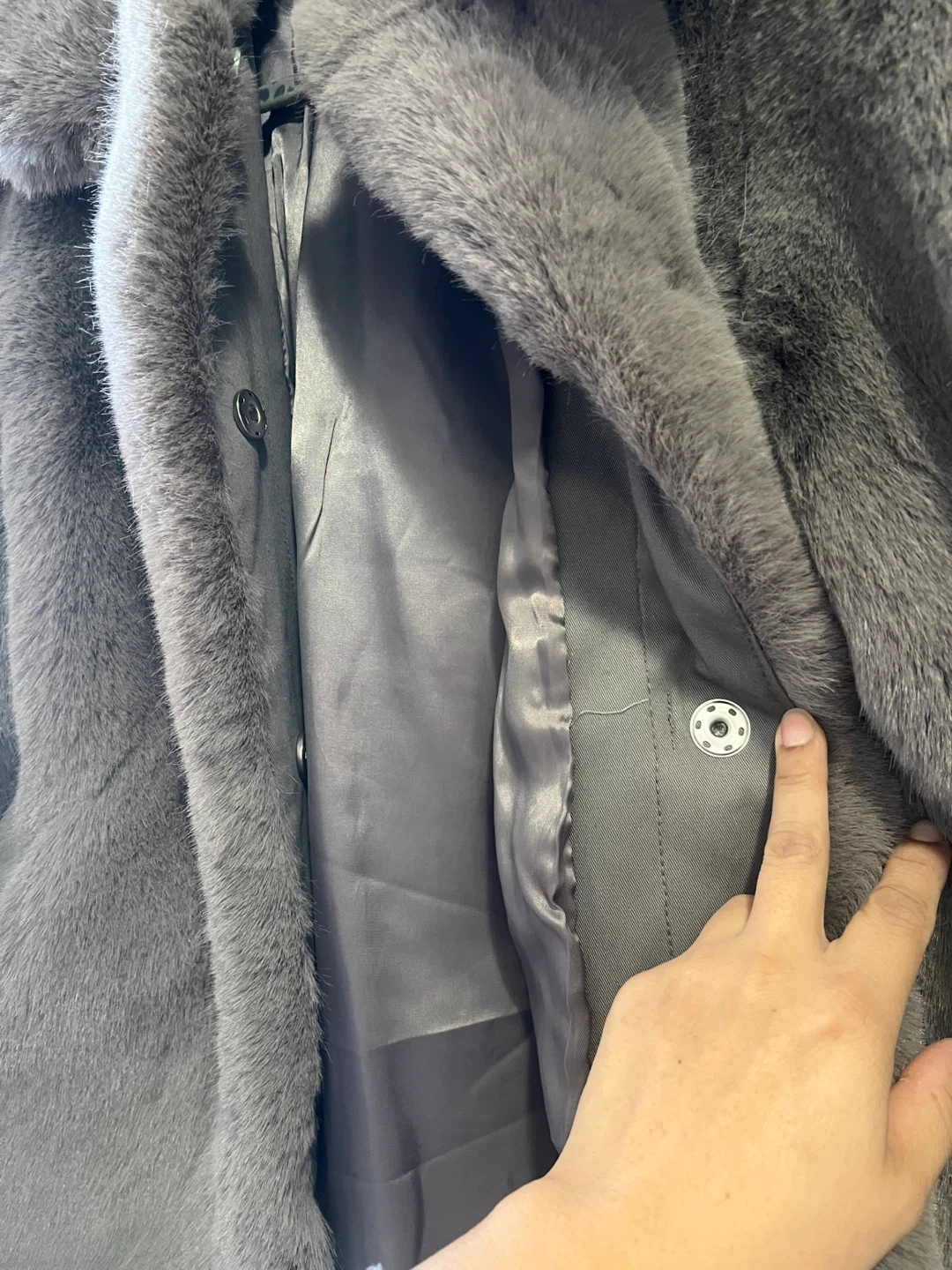 This is a warm and cozy grey faux fur coat. It features a classic collar and snap button closure. The interior has a smooth satin lining. Oversized