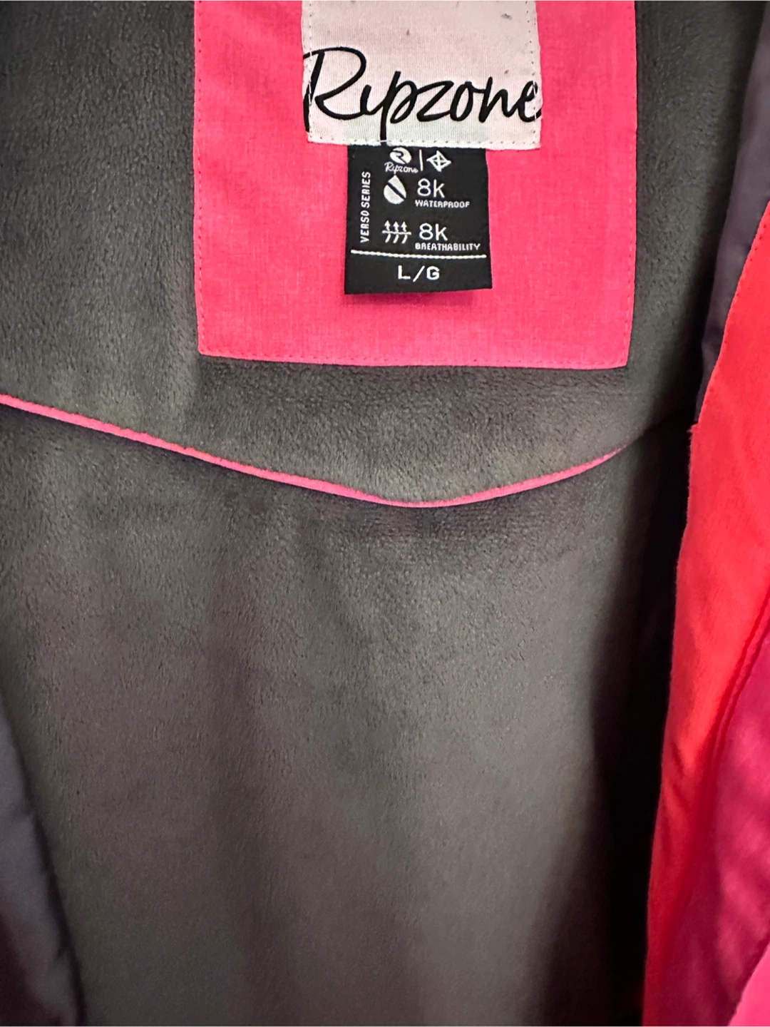 This pink Ripzone ski jacket is size L/G and features 8k waterproof and breathability ratings. It's made with grow-tech materials, allowing it to extend up to 2 inches. Includes a media pocket, goggle pocket, and underarm zippered ventilation.