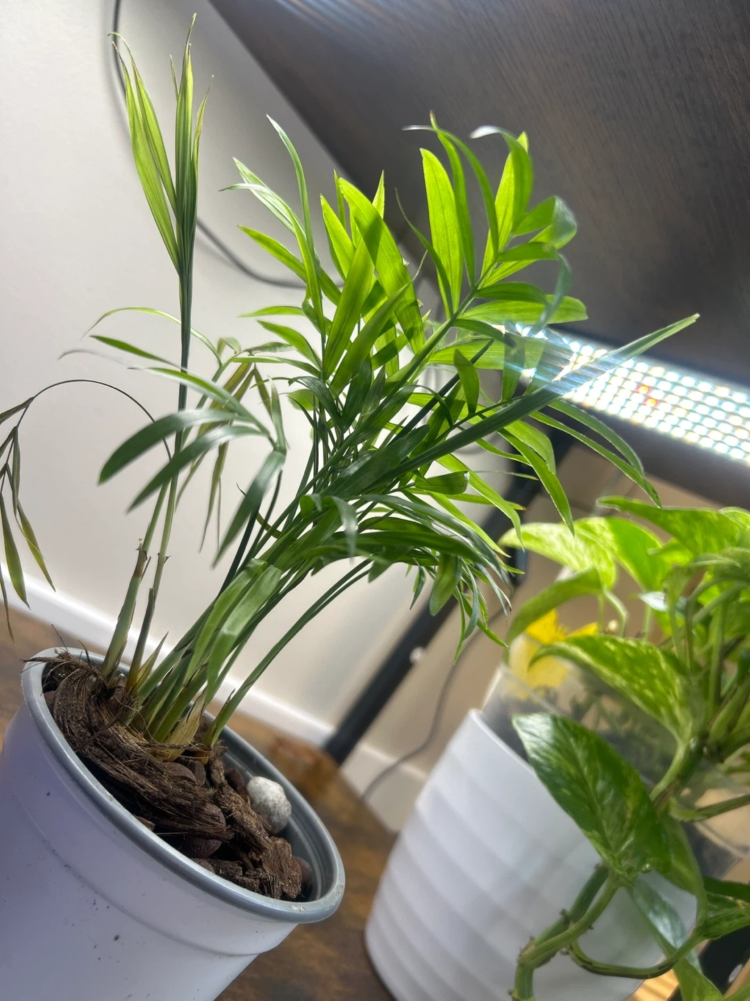 A small parlor palm plant in a white pot. It's a lovely green houseplant. This plant would be nice for adding some greenery to a desk or shelf.