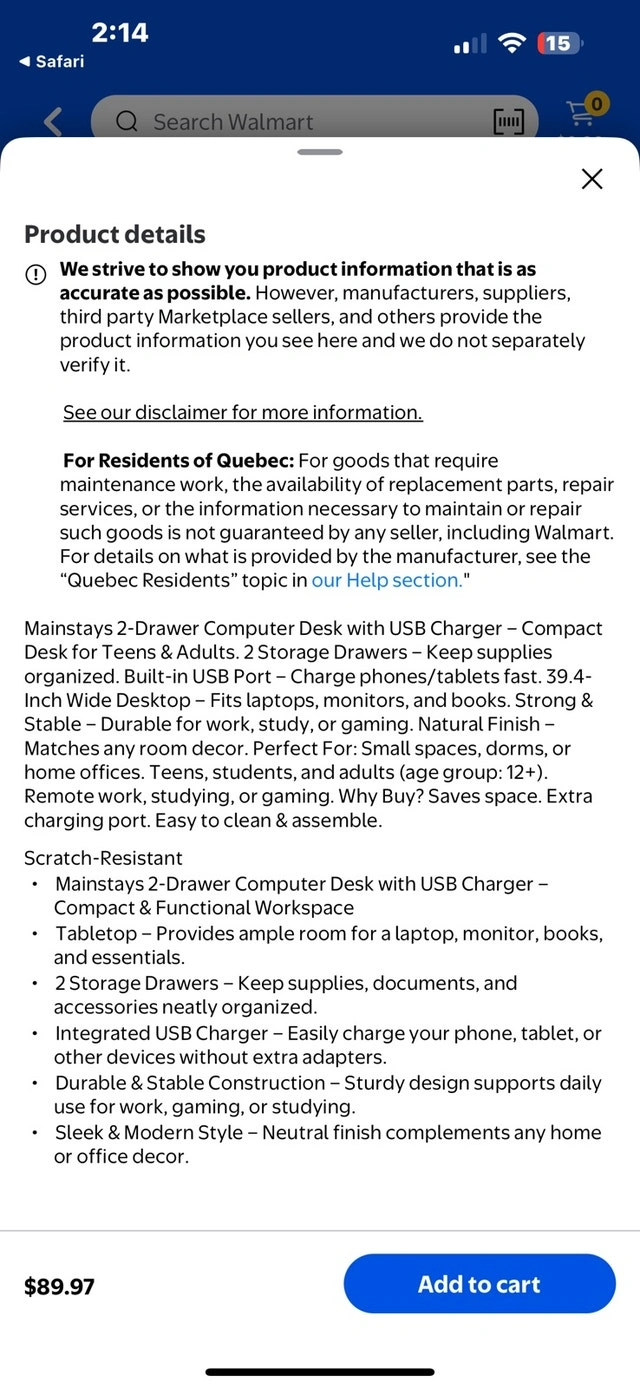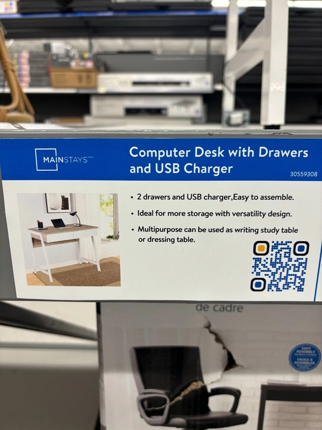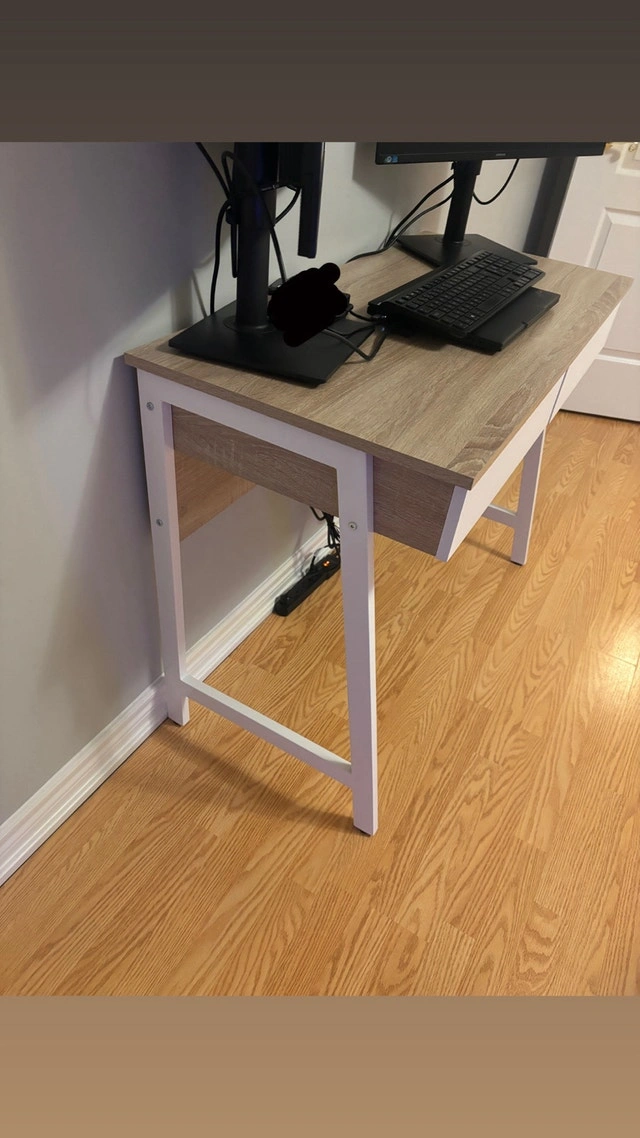 This is a Mainstays 2-Drawer computer desk, purchased from Walmart and only used for 2 months. It offers a compact and functional workspace with a tabletop that provides ample room for a laptop, monitor, books, and essentials. It also features 2 storage drawers to keep supplies neatly organized and an integrated USB charger to easily charge your devices.