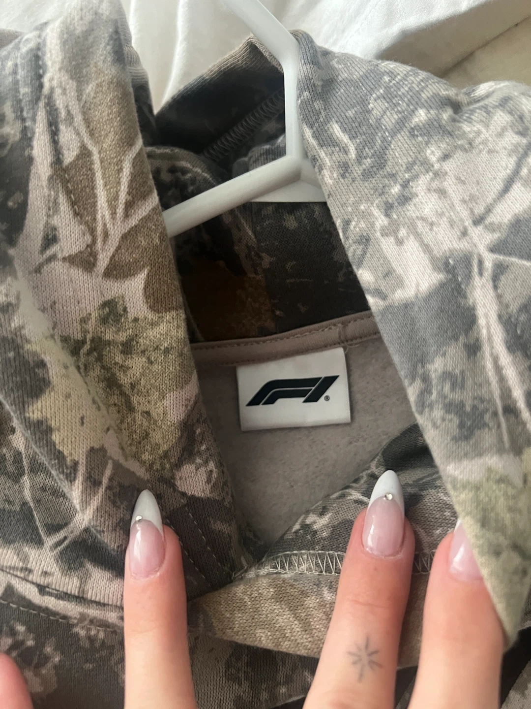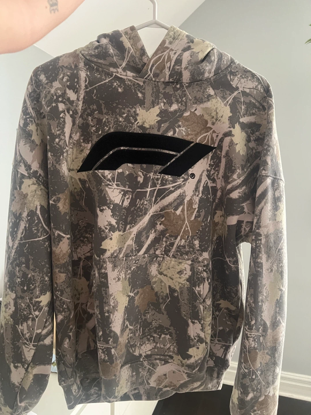 This is a camouflage hoodie with the Formula 1 logo on the front. It's a pullover style with a front pocket. Made from a soft, warm fabric. Size medium.