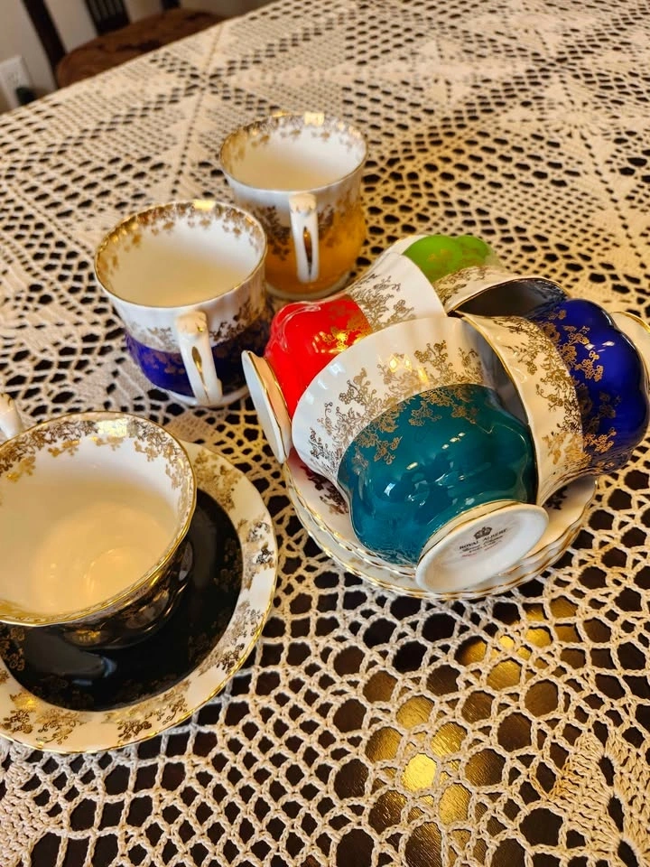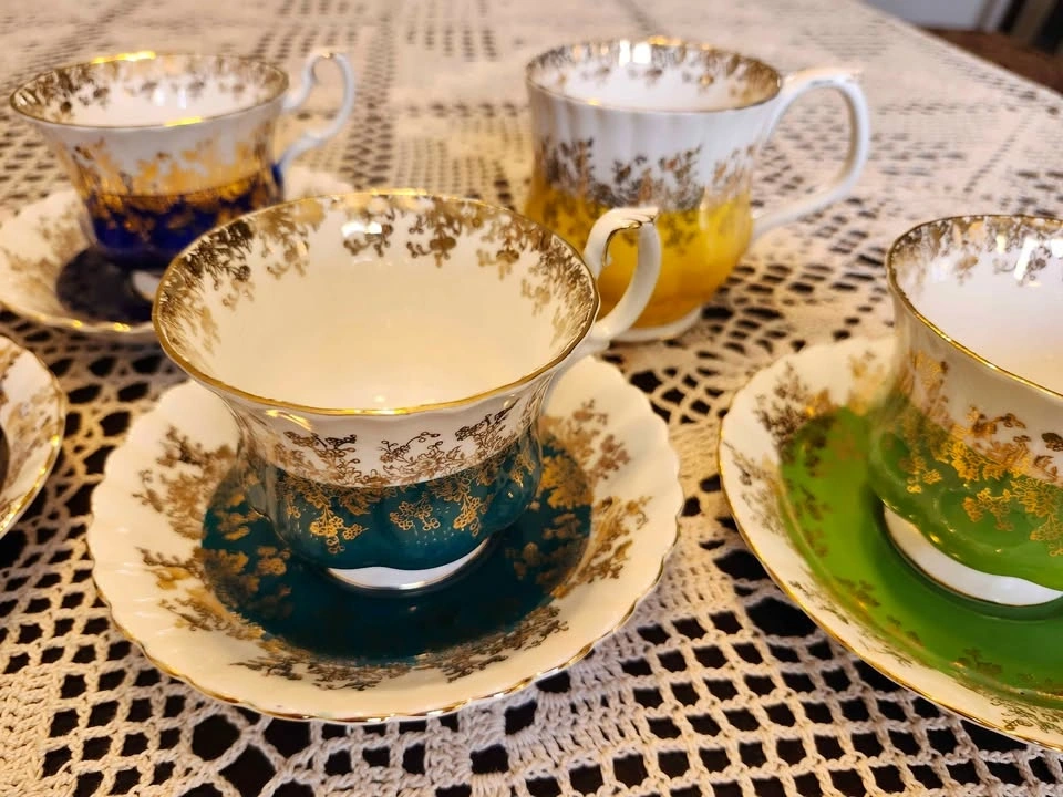 Vibrant Royal Albert Regal Series tea cup and saucer sets. 5 cups and saucers, 2 coffee mugs, each with intact beautiful gold trim. Different colors: red, blue, black, green, and teal. 2 Coffee mugs (royal blue and yellow). Great for collecting or tea time. Price is per cup and saucer.