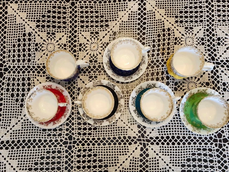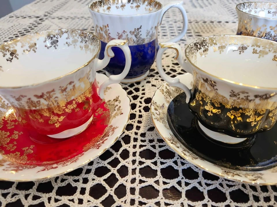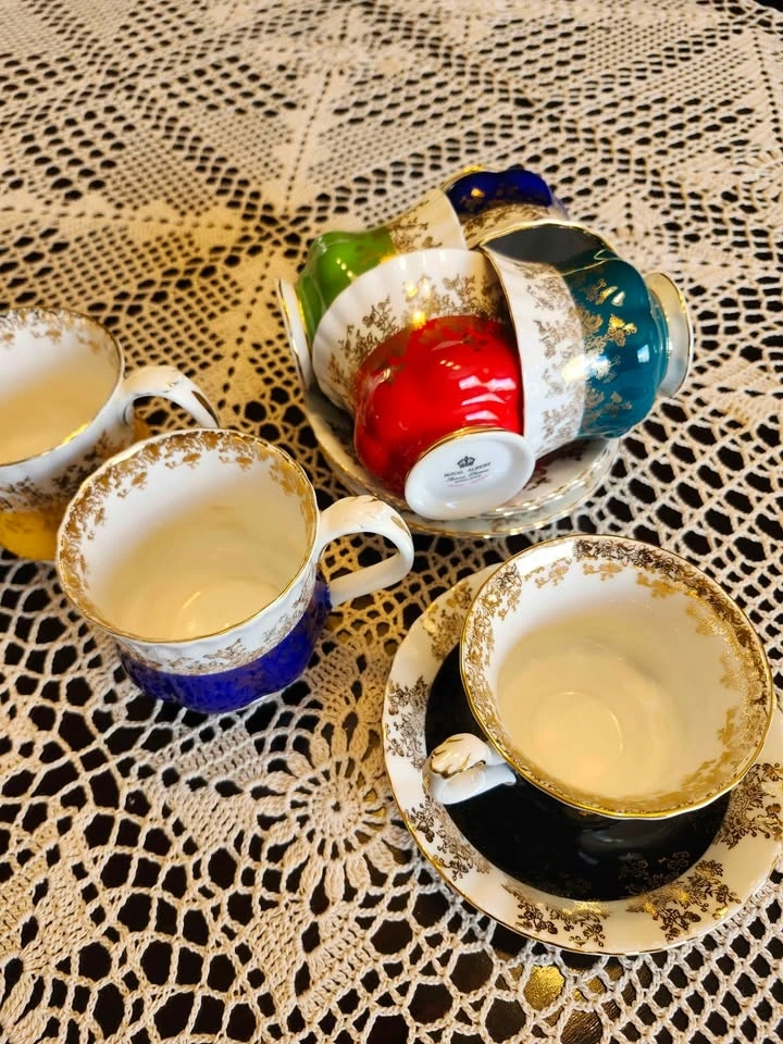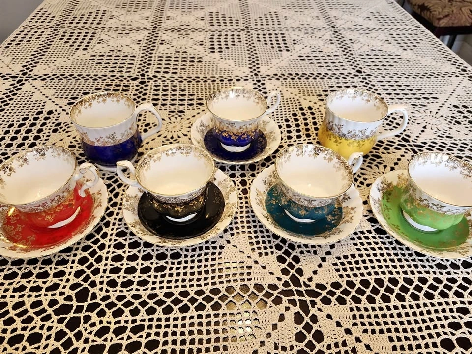 Vibrant Royal Albert Regal Series tea cup and saucer sets. 5 cups and saucers, 2 coffee mugs, each with intact beautiful gold trim. Different colors: red, blue, black, green, and teal. 2 Coffee mugs (royal blue and yellow). Great for collecting or tea time. Price is per cup and saucer.
