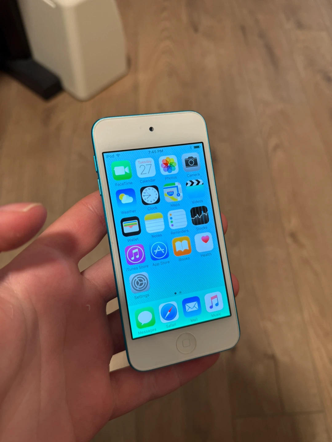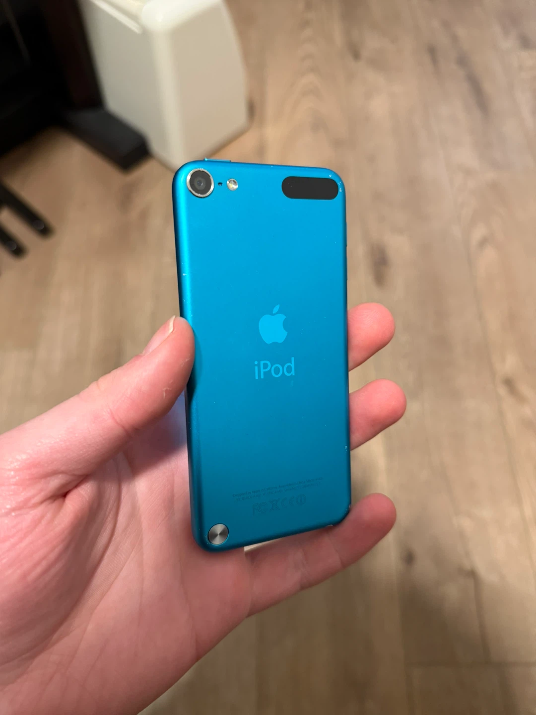 This is a blue Apple iPod Touch 5th Generation. It has a 4-inch Retina display and a 5-megapixel iSight camera. It's great for music, games, and apps!
