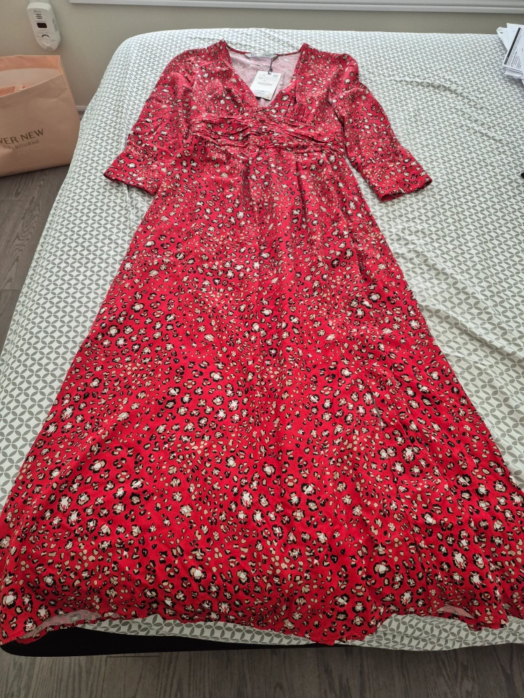 This is a gorgeous Zara maxi dress in a vibrant red animal print. It features a flattering V-neckline and long sleeves, perfect for transitioning between seasons. The dress is in excellent condition and ready for a new home!