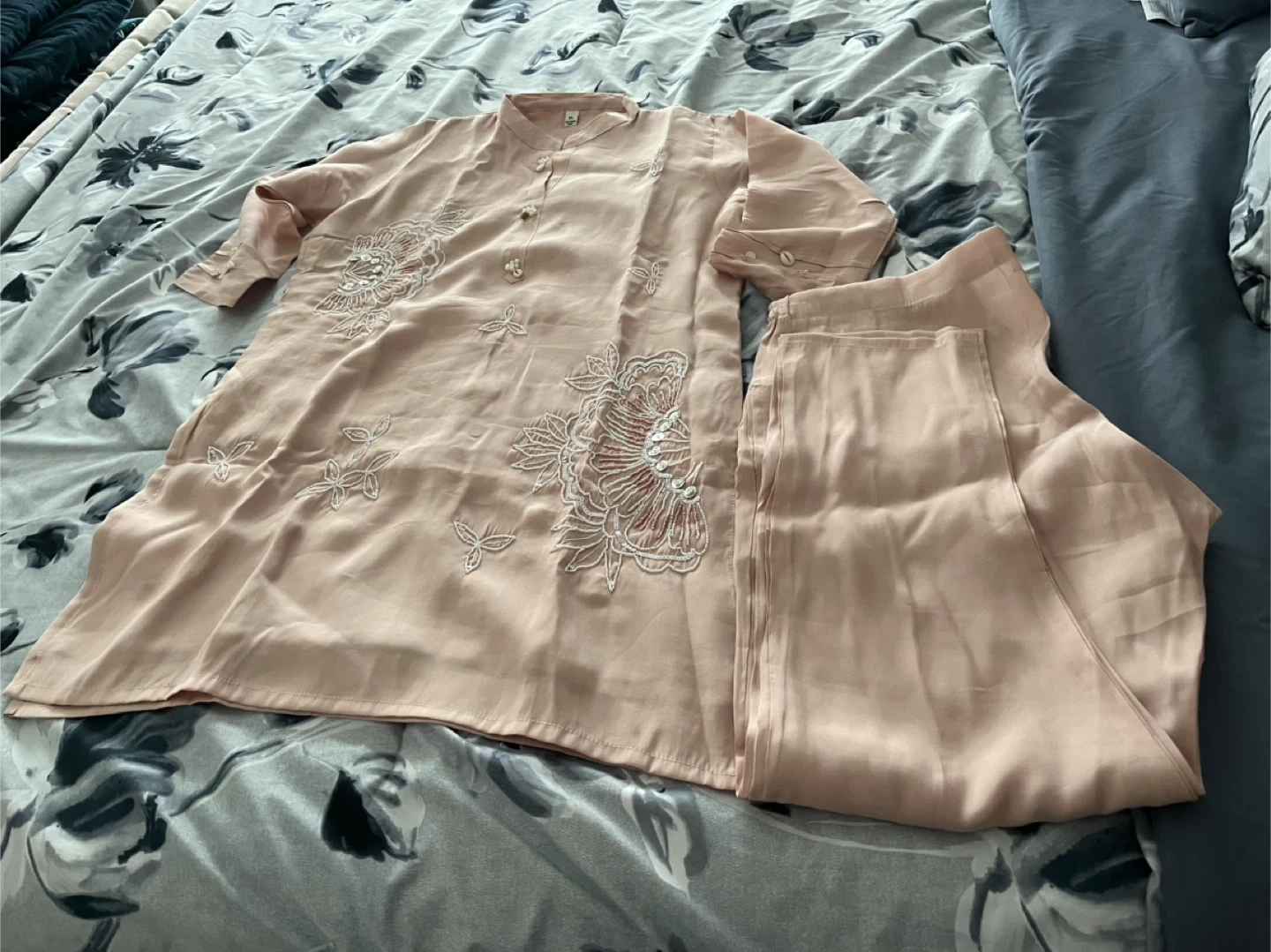 This is a lovely peach-coloured two-piece outfit. It features delicate white embroidery on the tunic and comes with matching trousers. The fabric appears to be a satin-like material,