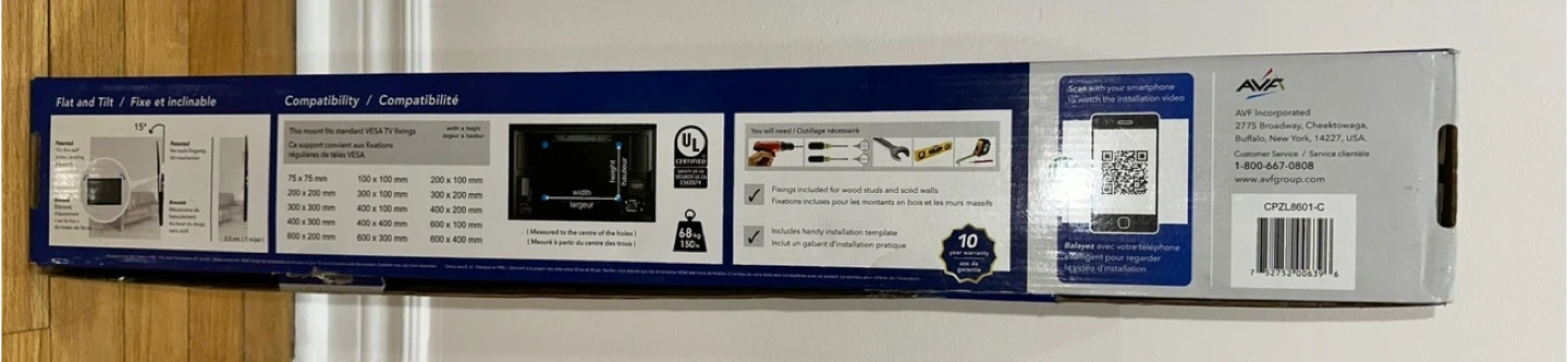 This is an AVA Super-slim Flat and Tilt TV Wall Mount. Supports TVs from 76-228 cm (30-90 inches). It's compatible with VESA TV fixings up to 800 x 400 mm and has a slim profile of 2.5 cm (1 inch) with up to 15Β° adjustable tilt. Includes hardware for wood studs and solid walls.