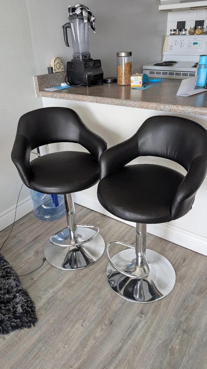 Two bar stools, black leatherette seats and backs. Chrome bases. Good used condition. Slight wear and some scratches on the leather but otherwise in ok condition