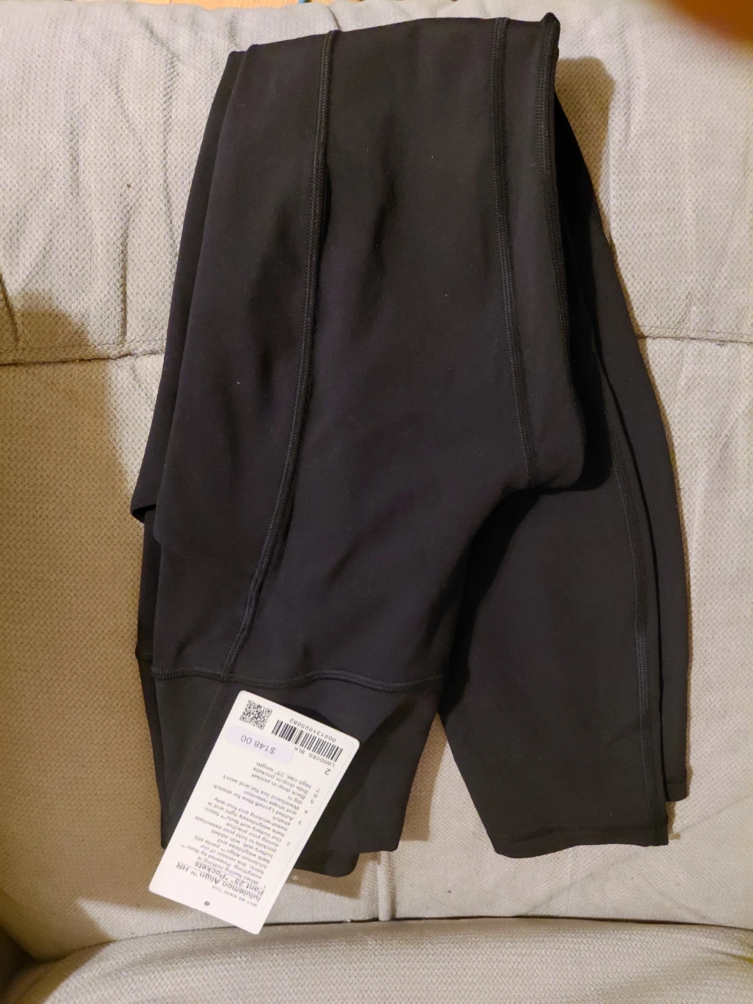These black Lululemon Align leggings are crafted from a soft, stretchy fabric. They feature a high rise and are full length. The tag indicates a price of $148.00. Size 2