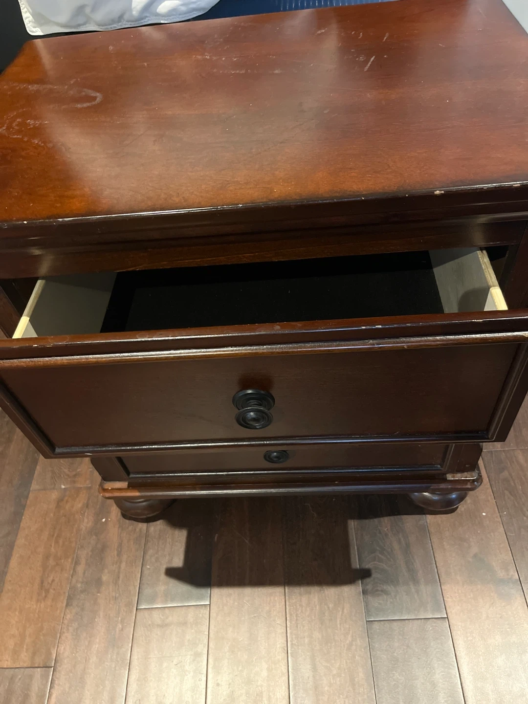 This is a dark wood nightstand with two drawers. It's a solid piece of furniture. It's useful for keeping your bedroom tidy. Would look nice in a bedroom.