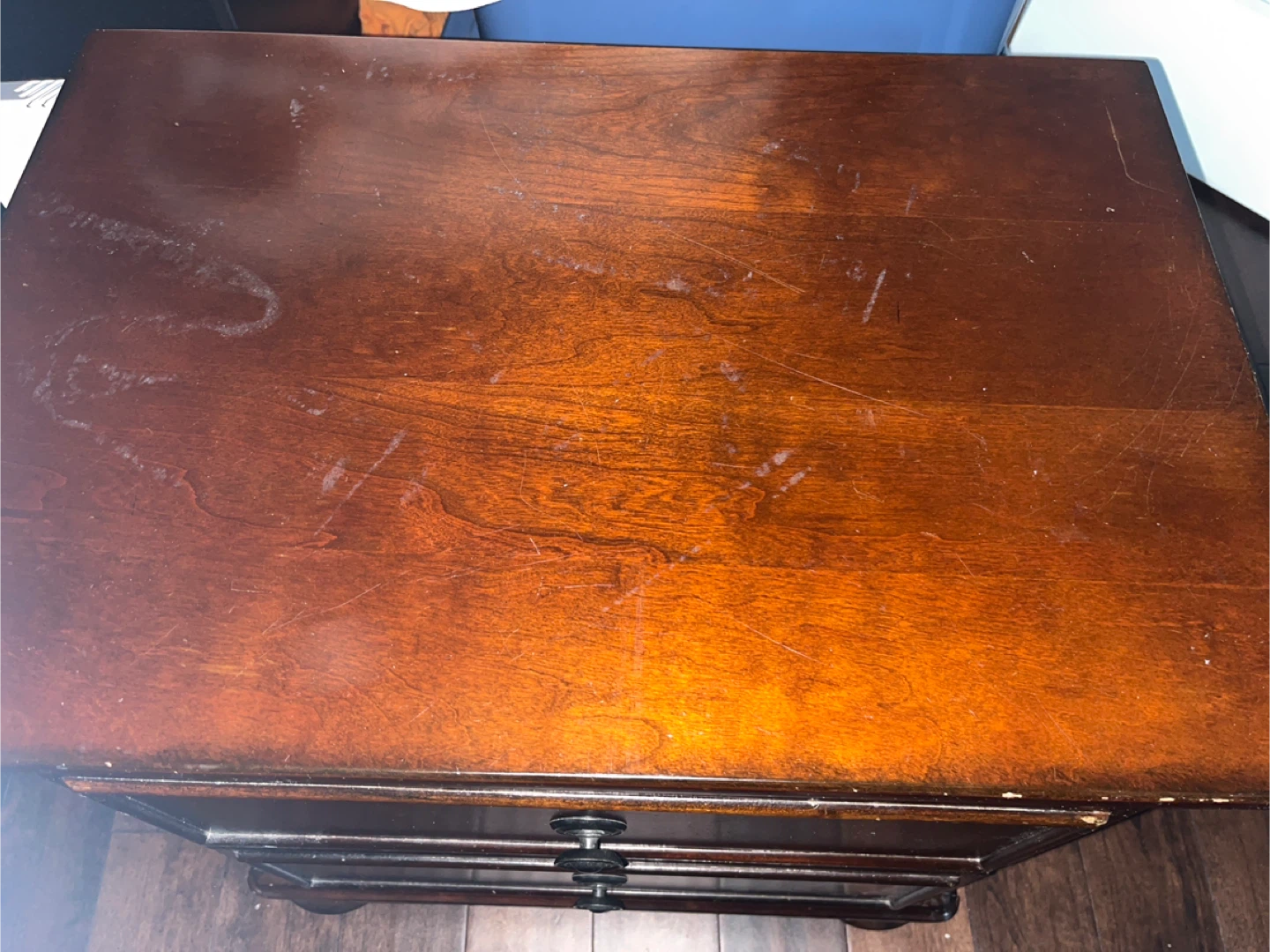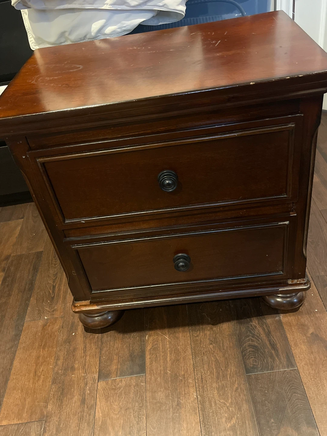 This is a dark wood nightstand with two drawers. It's a solid piece of furniture. It's useful for keeping your bedroom tidy. Would look nice in a bedroom.