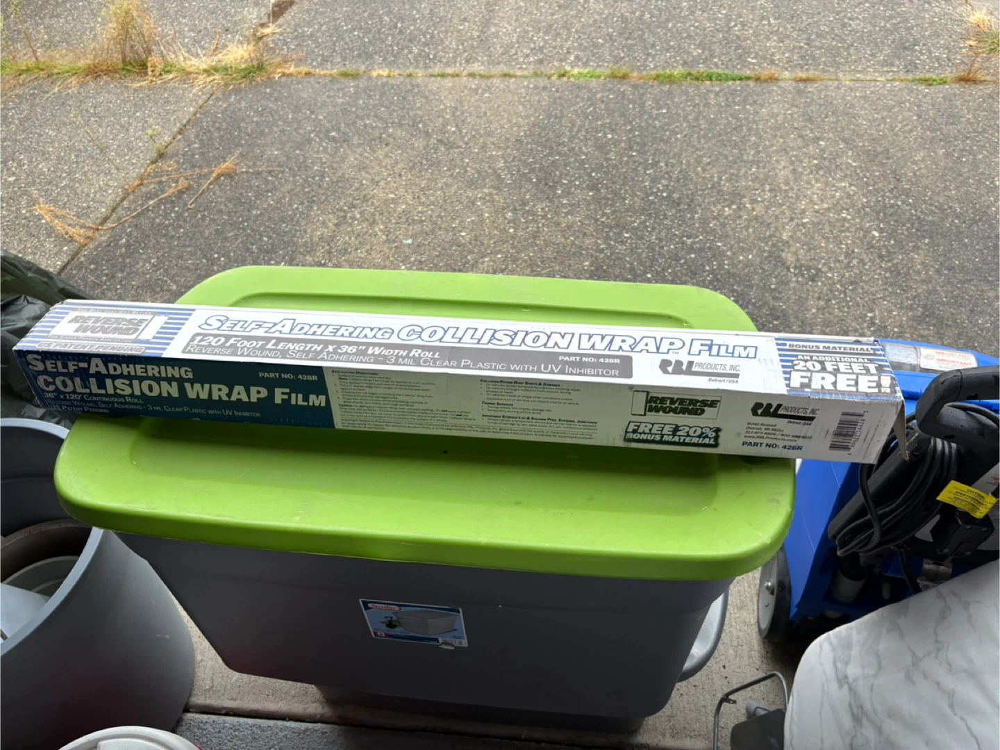 Selling a brand new roll of Reverse Wound Self-Adhering Collision Wrap Film. It's 36" x 120' continuous roll, and it's made of 3 mil clear plastic with a UV inhibitor. The box is included.
