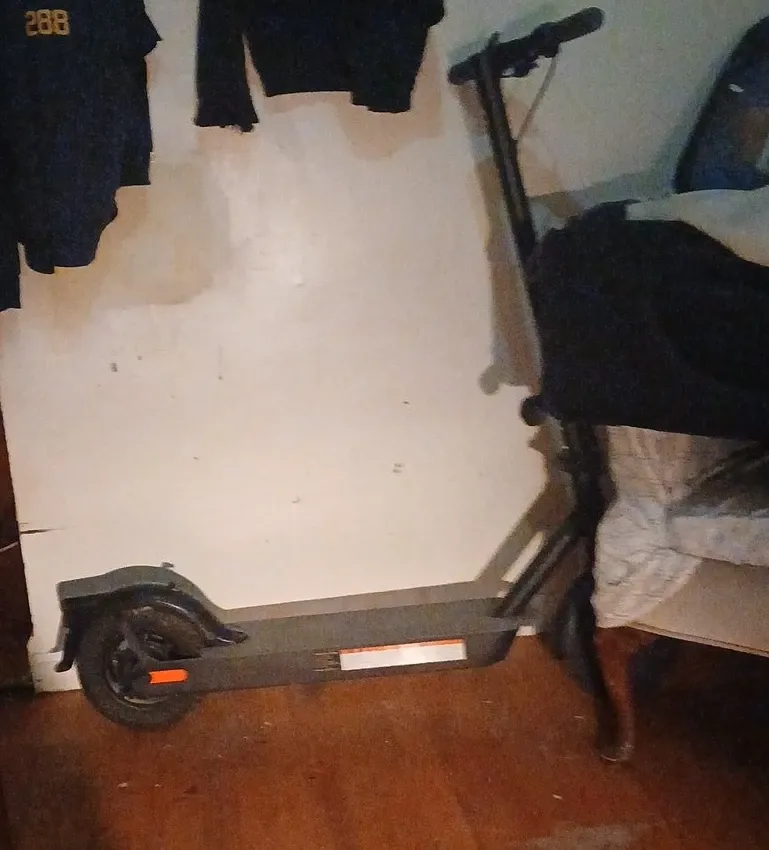 Gray electric scooter. Has a platform and handlebars. Rear wheel with fender. Folds for storage.