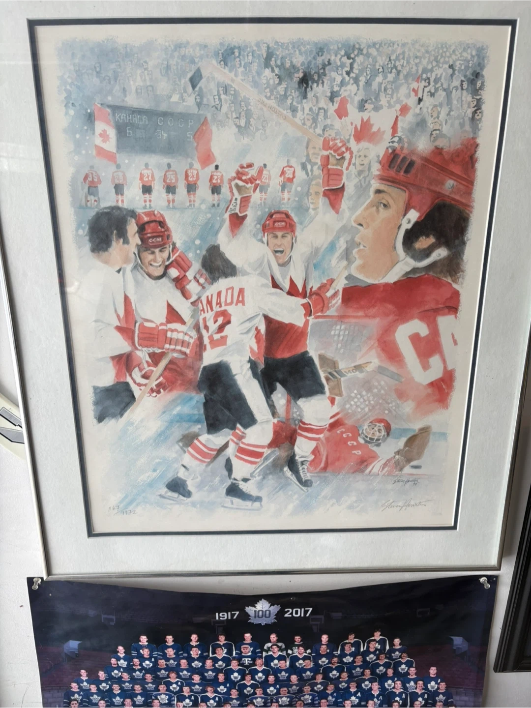This framed print depicts the iconic Canada vs. USSR Summit Series hockey game. It features a vibrant scene of Canadian players celebrating a goal. Artwork signed by Glenn Horton.