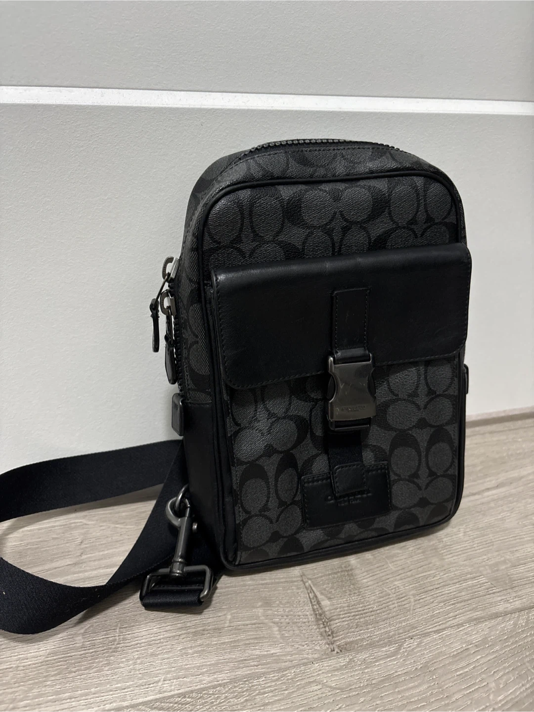 Coach crossbody bag with signature print. Features a buckle closure and adjustable strap. Canvas and leather material.