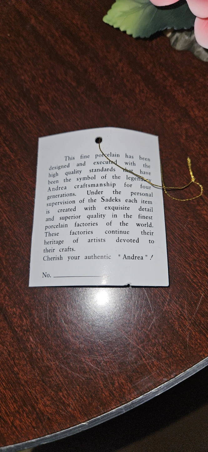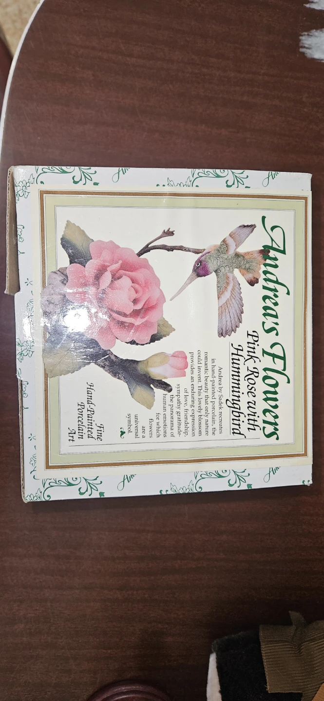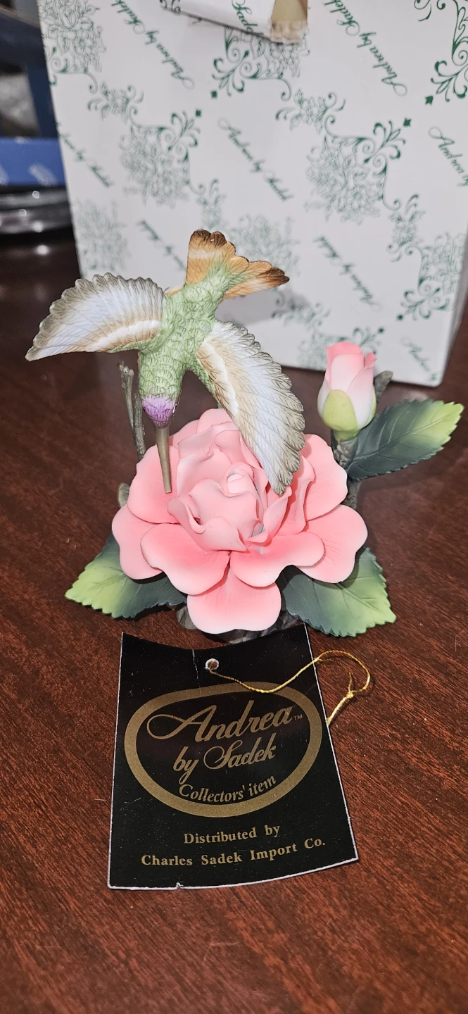 This fine porcelain figurine by Andrea by Sadek is a collector's item. It features a hummingbird hovering over a pink rose. The original box is included!