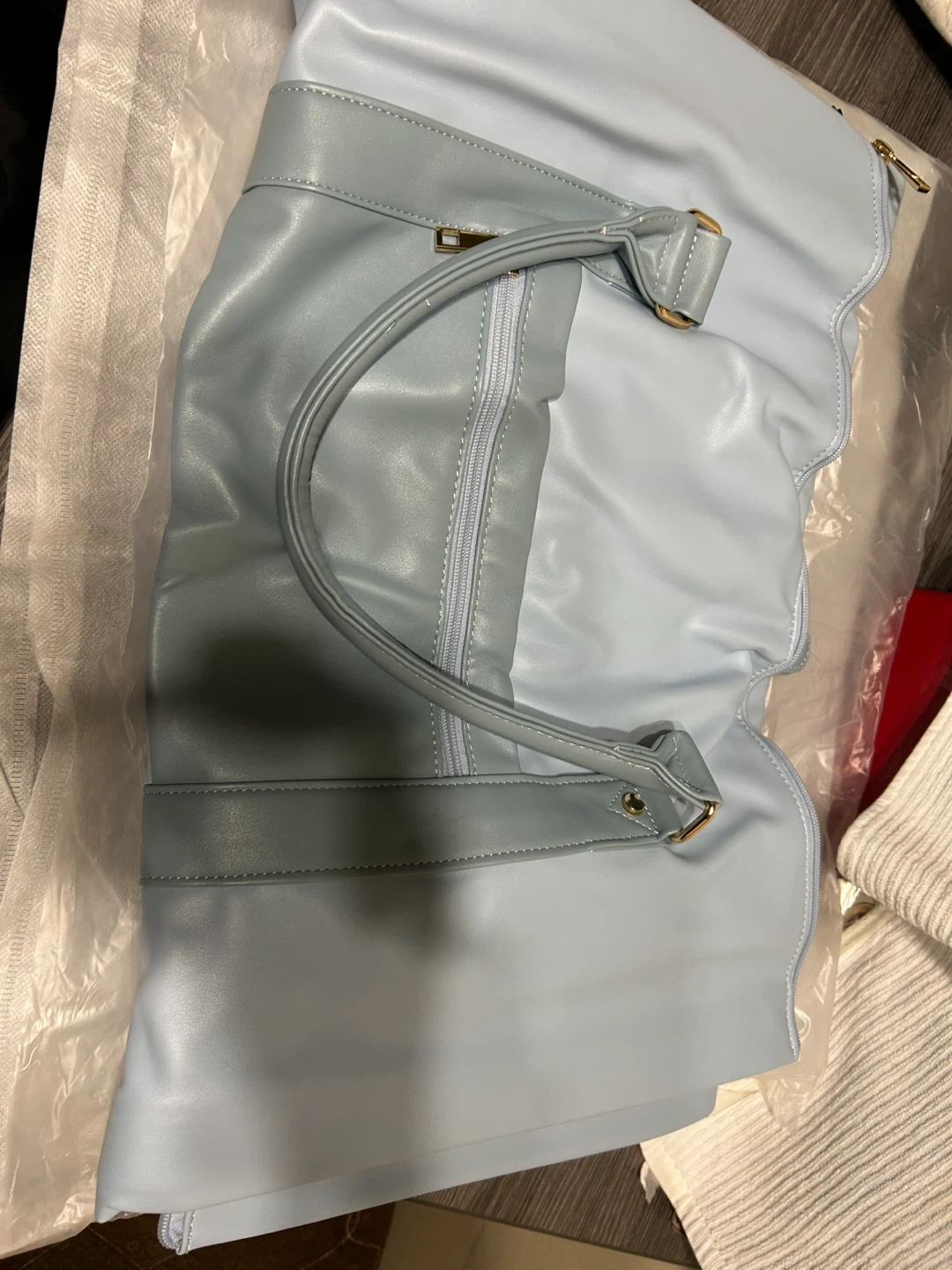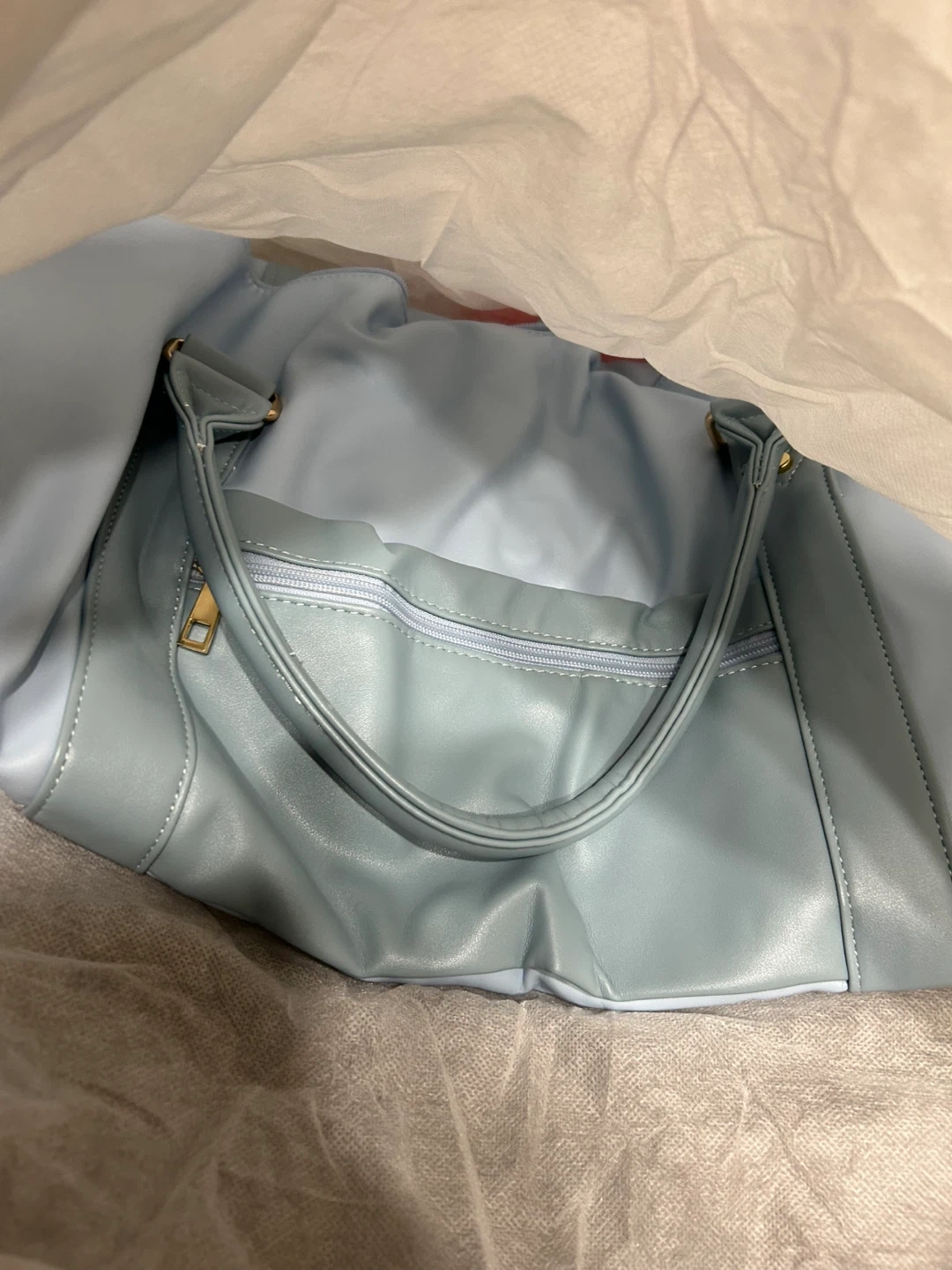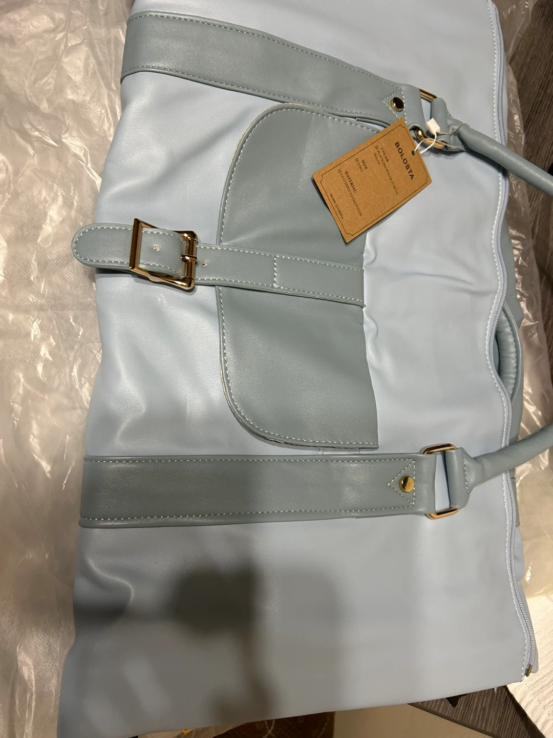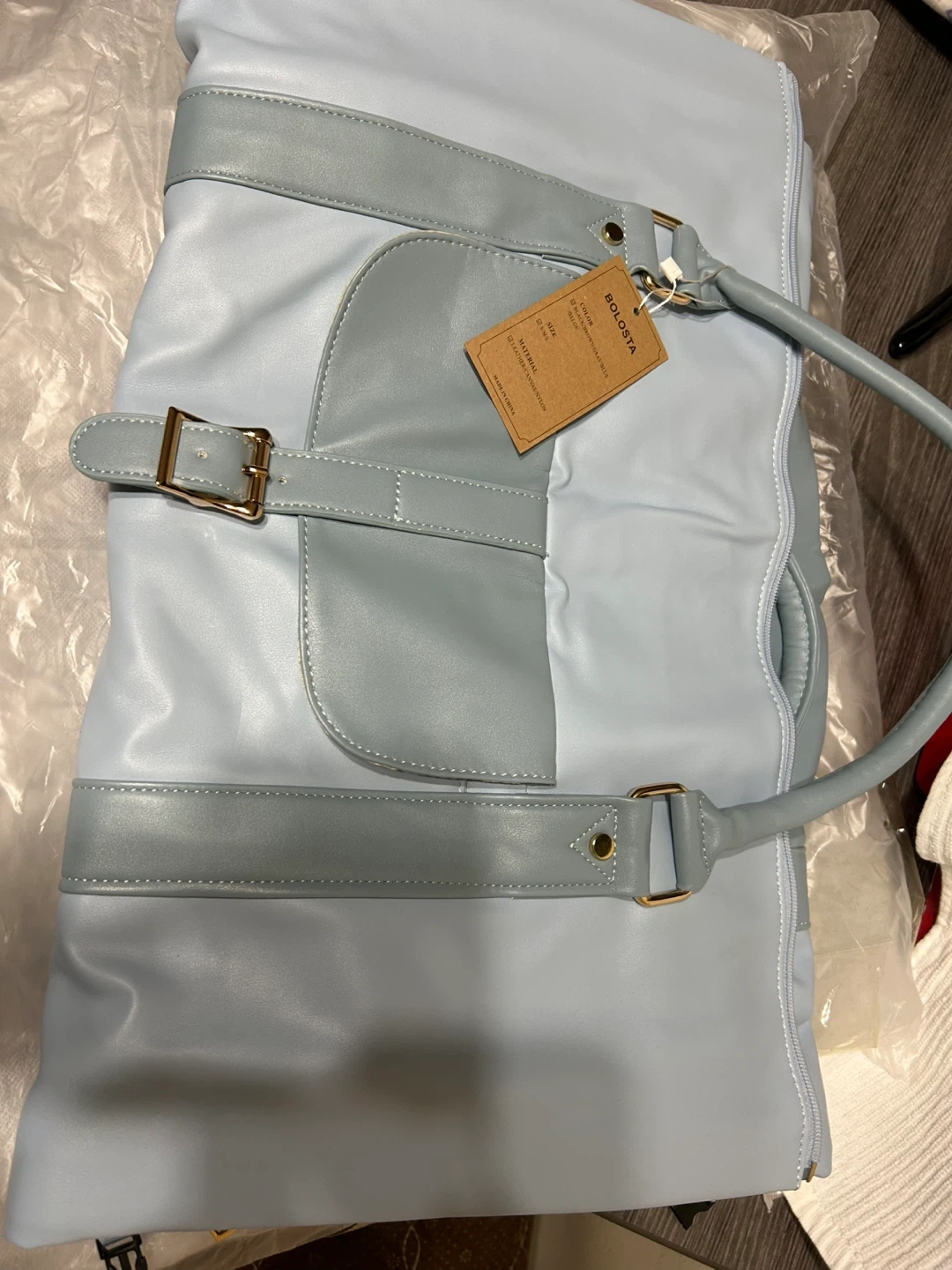 Selling a BOLOLSTA barrel duffel bag in a lovely light blue colour! It's made with water-resistant PU leather and has a removable shoulder strap. It also features ventilated air holes and bottom rivets for added protection. The quick-release buckle makes it easy to use on the go!