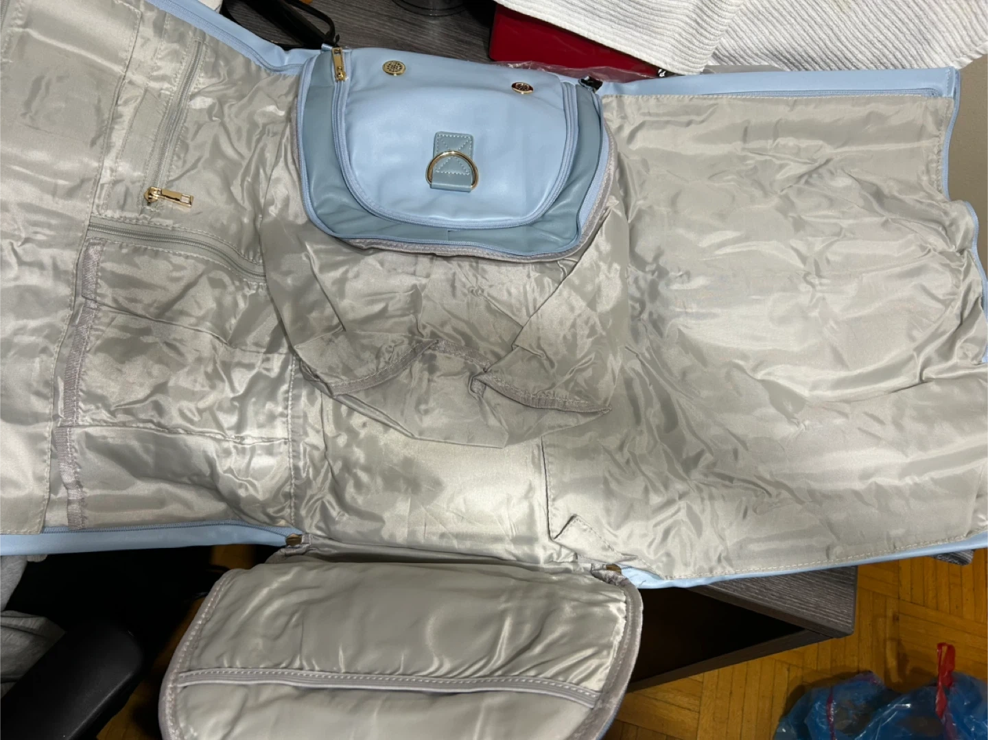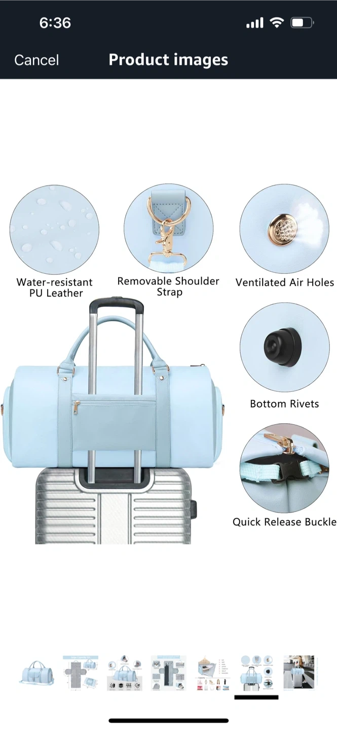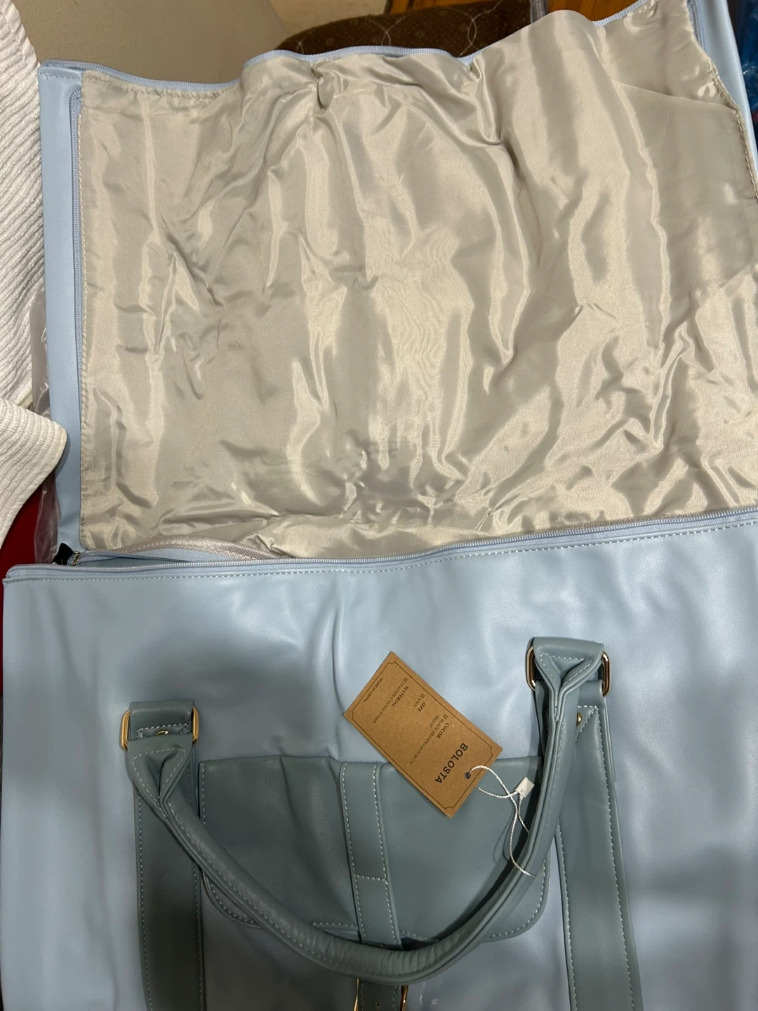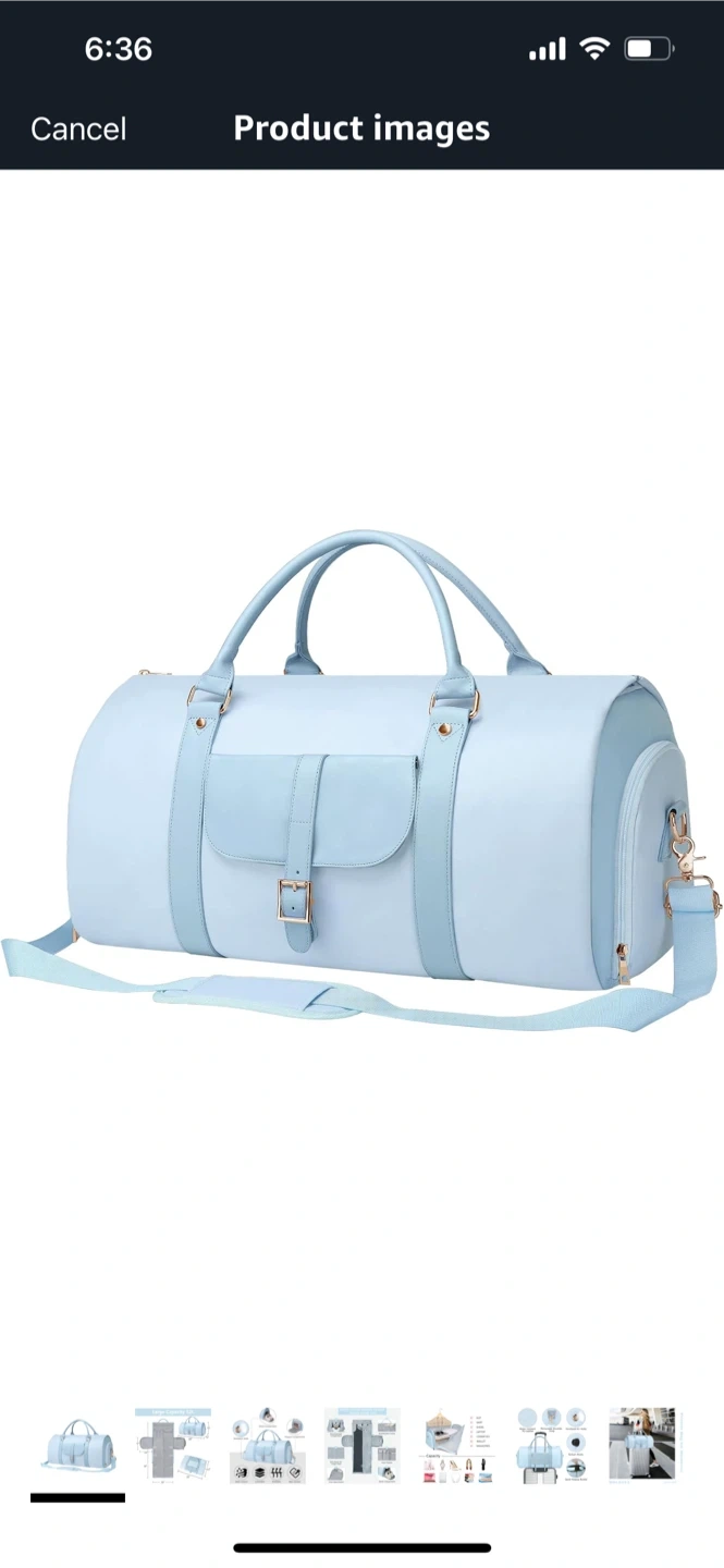 Selling a BOLOLSTA barrel duffel bag in a lovely light blue colour! It's made with water-resistant PU leather and has a removable shoulder strap. It also features ventilated air holes and bottom rivets for added protection. The quick-release buckle makes it easy to use on the go!
