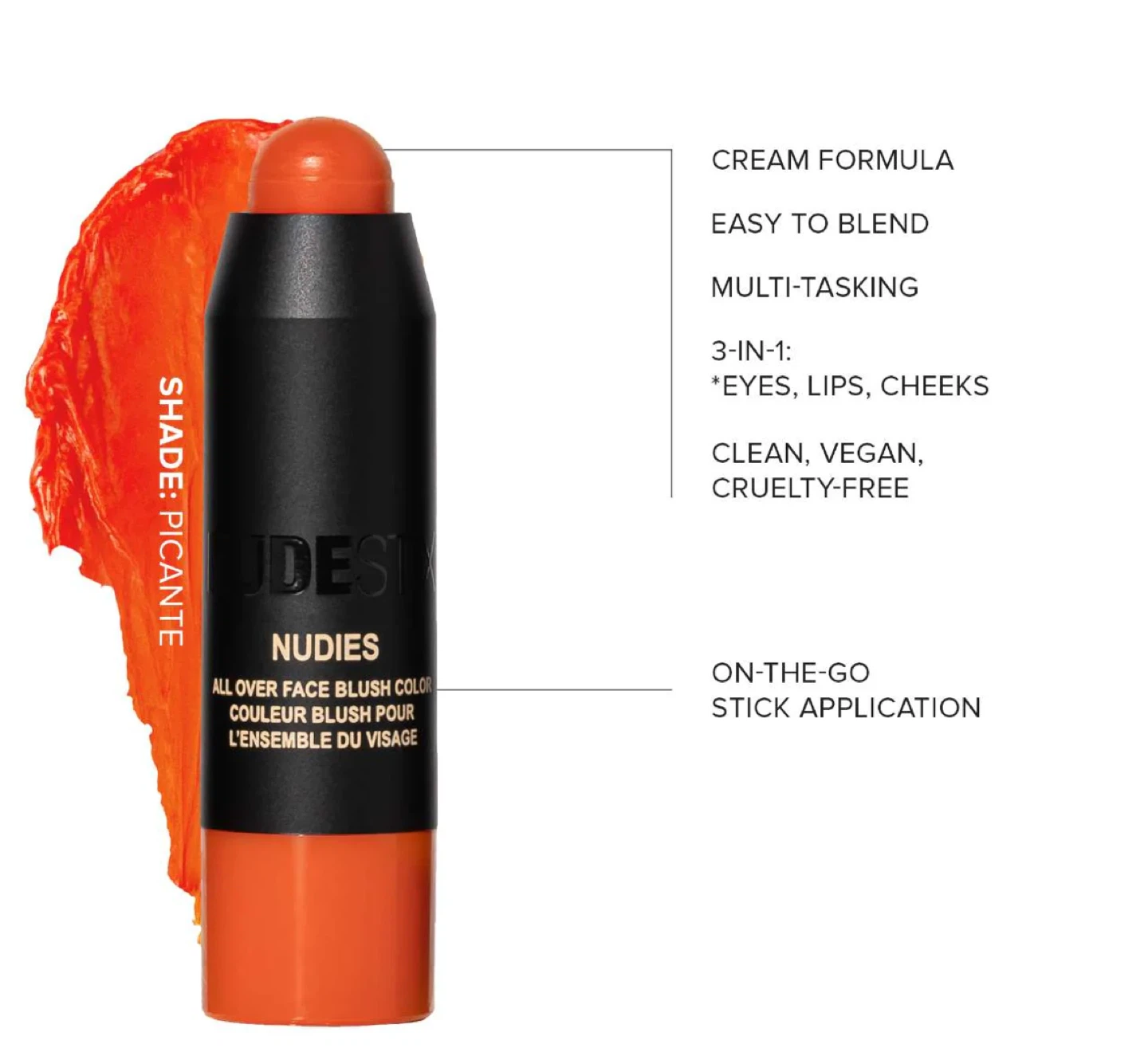 This is the Nudies All Over Face Blush Color in the shade Picante. It's a cream formula designed for easy blending and multi-tasking. This stick application is convenient for on-the-go touch-ups.
