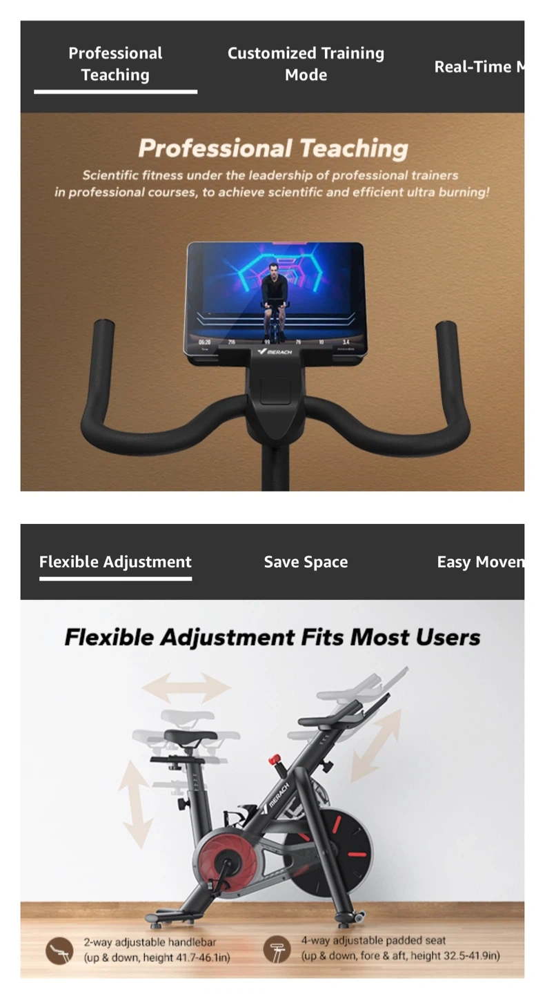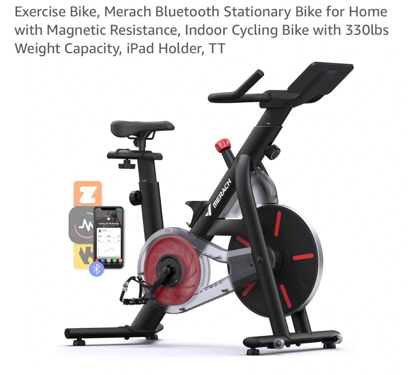 This Merach stationary bike offers magnetic resistance for indoor cycling. It has a 330lbs weight capacity and an iPad holder. The seat is 4-way adjustable and the handlebars adjust 2-way, fitting most users.