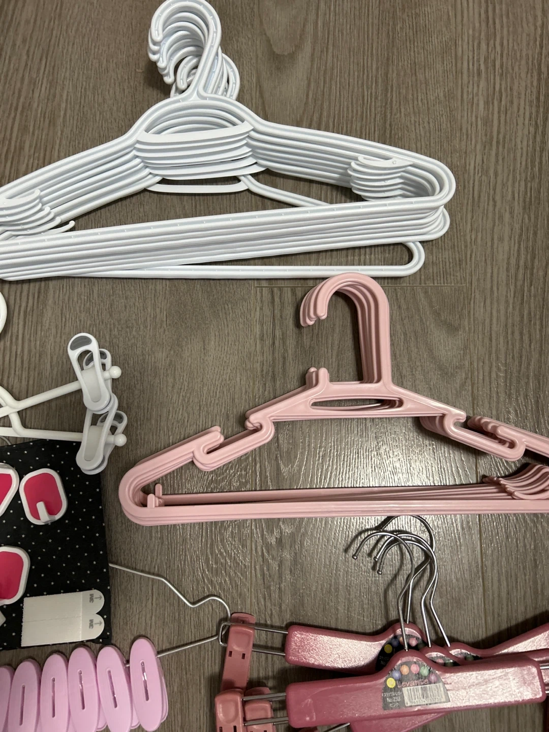 An assorted white adhesive hooks, pink clothespins, and 3M Command strips.