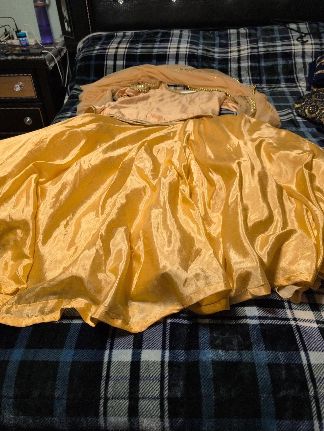This is a beautiful gold lehenga choli set. It features a shimmering satin skirt and a matching embroidered blouse with a dupatta. Perfect for cultural events or parties!